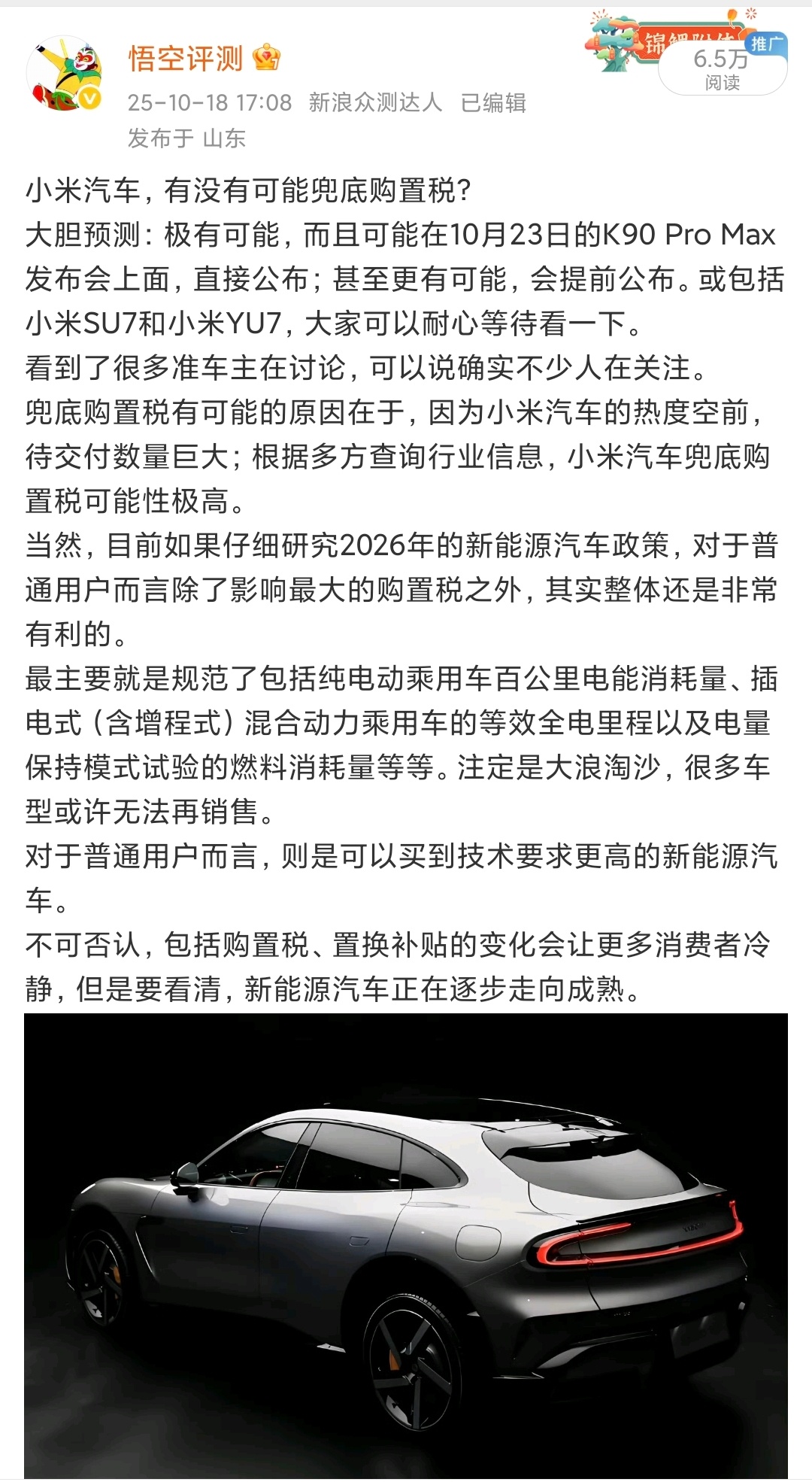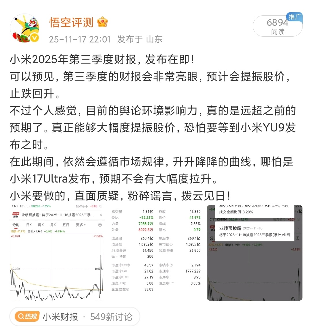 恭喜小米汽车,单季度开始经营盈利,一切向好!不过,小米SU7处于改款的档口,这时候要更加关注新增订单量的数据,其次才是产能提升以后的月交付量数据。之前我曝光的小黑夜之晴的微博,他已经删帖了,目前Q3的业绩,实际证明他已经在一定程度上打脸自己了。之前的多个预测都已成真,现在说一些不好听的预测:① 小米SU7改款,速度还是慢了。目前不少用户在等待改款车,但是现在包括准确的改款车信息都非常匮乏,可能会让一些等待的用户转到其他车型,所以小米SU7改款要提速,实际上与小米17Ultra一同在12月份发布,恐怕是最优解,还可以冲击一波年底销量;② 小米YU9也要提速,这款车,毋庸置疑是小米股价的定心丸,稳定回升这款车意义重大。③ 小米YU7交付周期还是过长;④ 直面舆论,针对集中的问题和真实车主的疑虑予以解答,消除负面影响。个人认为,2026年对于小米汽车,才是真正关键的一年。