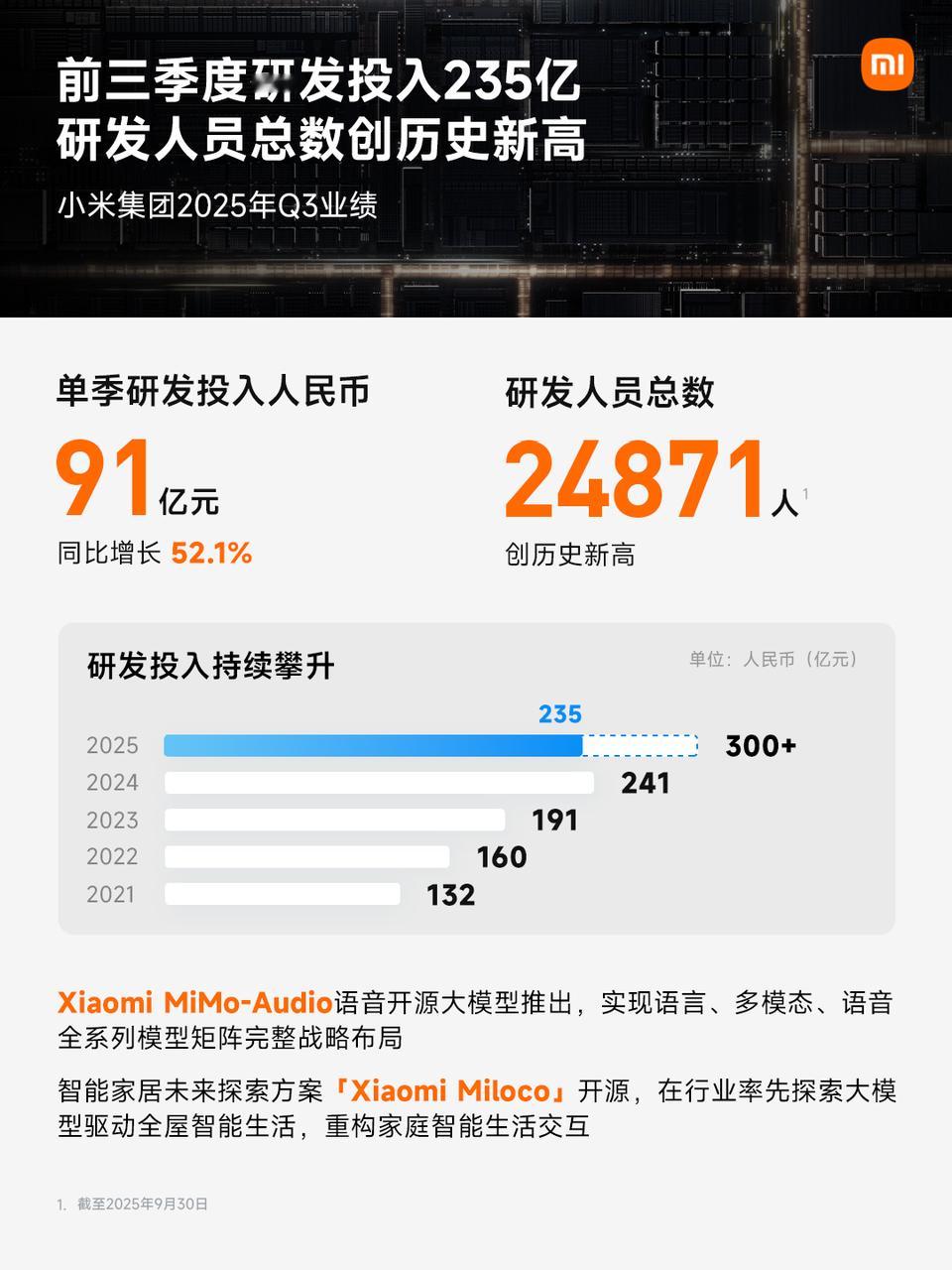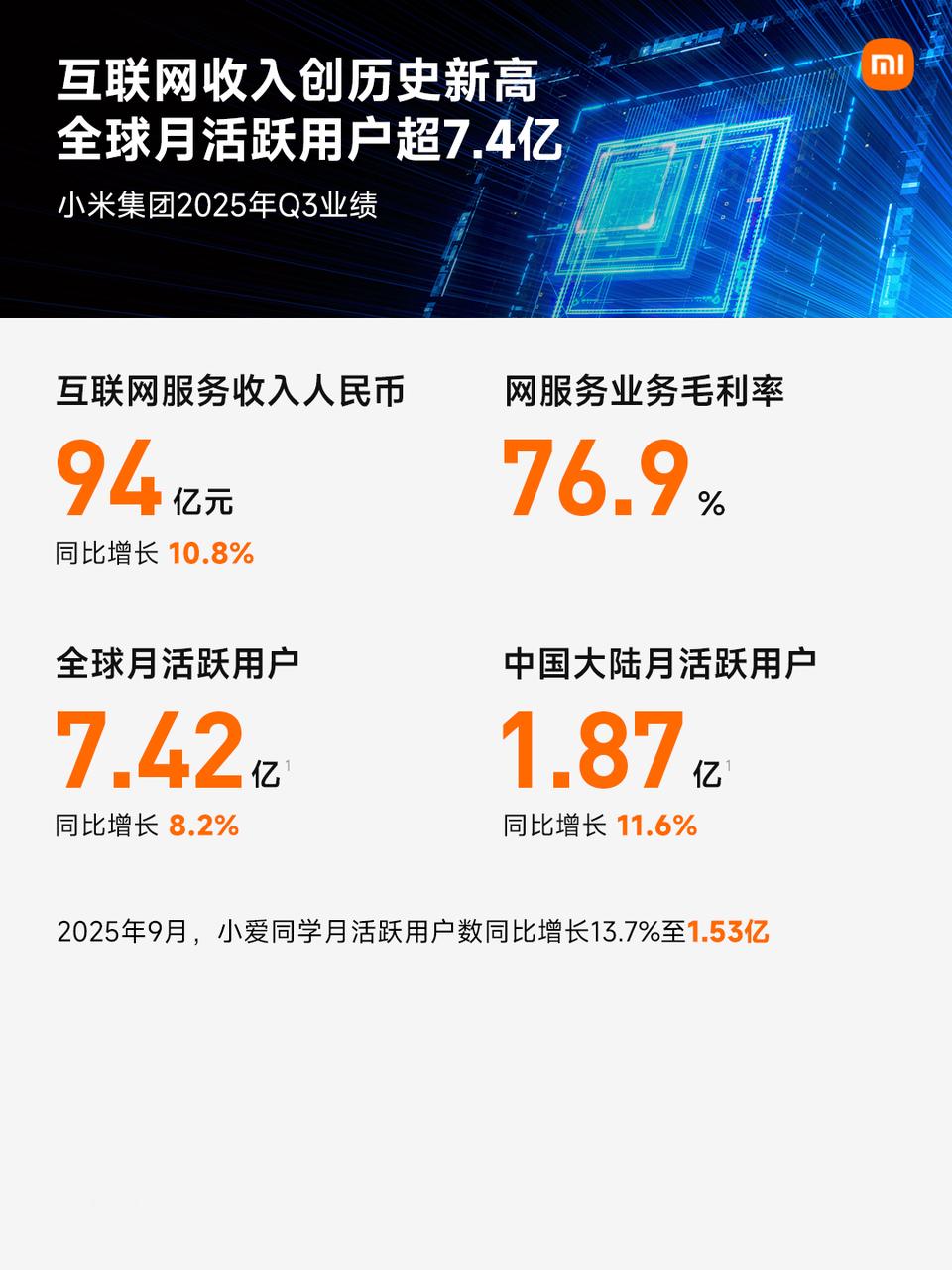 小米集团2025Q3财报:强韧增长,稳步向前。总收入1131亿元,连续4个季度超