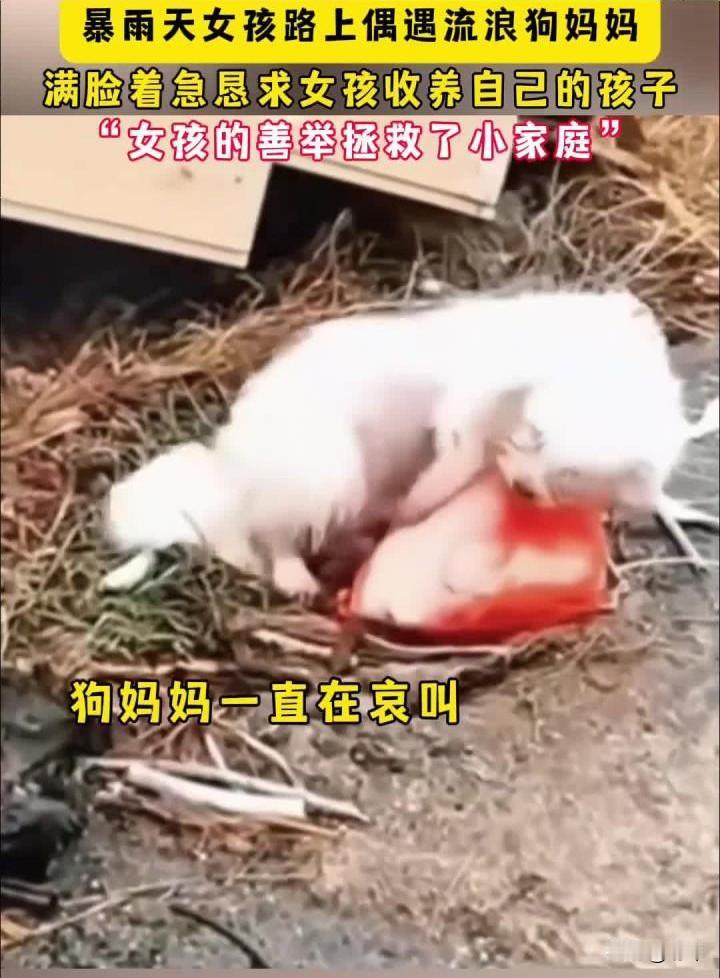 一个暴雨天,一位小姐姐撑着雨伞准备回家吃饭,当她走到一条小路上的时候,偶遇一只流浪狗妈妈,只见它趴在小姐姐面前不停地作揖,似乎有求于小姐姐。 善良的小姐姐顿时明白了它的意图,于是就跟着它走,结果看到路边有一只状态不是很好小奶狗,这肯定是它的狗宝宝了。原来狗妈妈是想祈求小姐姐救救它的孩子,它一直在旁边哀嚎。 这叫声令小姐姐顿时心生怜,于是就准备收养狗狗母子,她顾不上吃饭,直接把它们送去宠物医院治疗,之后就带回去收养了,相信在她的照顾下,这对母子也会越来越好的。