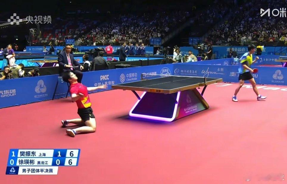 樊振东打球真的太专注了,一个不注意直接跪地上了,不过核心力量真的好,一下子站起来了
