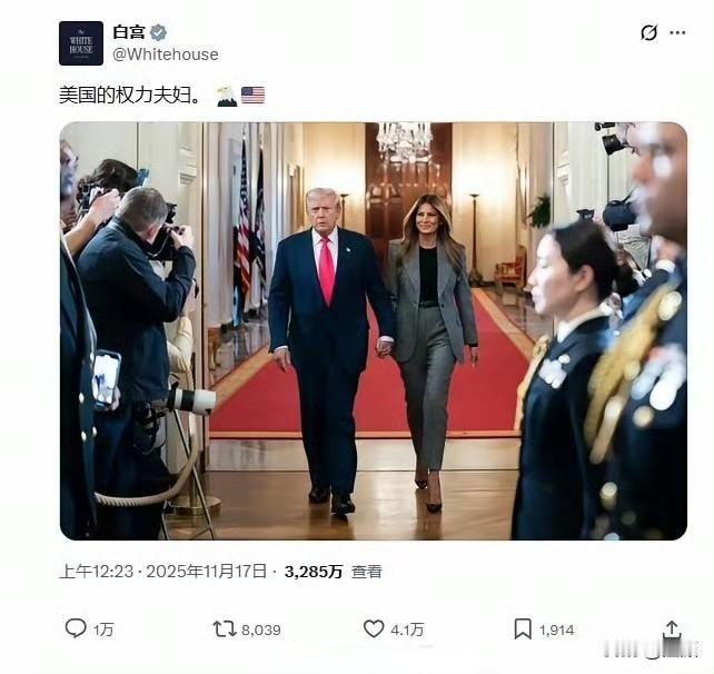 白宫官号昨天发布特朗普夫妇合影,盛赞其为“美国权势夫妇” 然后,美国网友制作了一