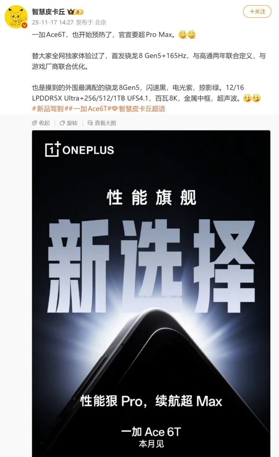 【一加李杰透露 Ace 6T 搭载 8 开头大电池 + 100W 快充,将会是唯一一款】一加 Ace 6T 手机将于本月发布,号称「性能旗舰新选择」,全球首发搭载高通年度旗舰芯片 —— 第五代骁龙 8,搭载风驰游戏内核,配备 8000 毫安时以上电池。一加中国区总裁李杰透露,一加 Ace6T 支持 100W 超级闪充,8 开头大电池 +100W 充电速度同时实现,Ace 6T 将会是唯一一款。一加 Ace 6T 将首发骁龙 8 Gen 5 芯片 +165Hz 屏幕,拥有闪速黑、电光紫、掠影绿三色可选,配备 12/16GB LPDDR5X Ultra 内存,可选 256GB/512GB/1TB UFS 4.1 存储,搭载 8000mAh 电池,支持百瓦快充,拥有金属中框、超声波指纹等配置。骁龙 8 Gen 5 芯片的制程工艺及规格将与骁龙 8 Elite Gen 5“一体双生”,安兔兔跑分>骁龙 8 至尊版,Geekbench 6 单核性能<骁龙 8 至尊版,多核跑分>骁龙 8 至尊版,在未来的中端旗舰产品线中会逐步取代 N-1 迭代的形式。