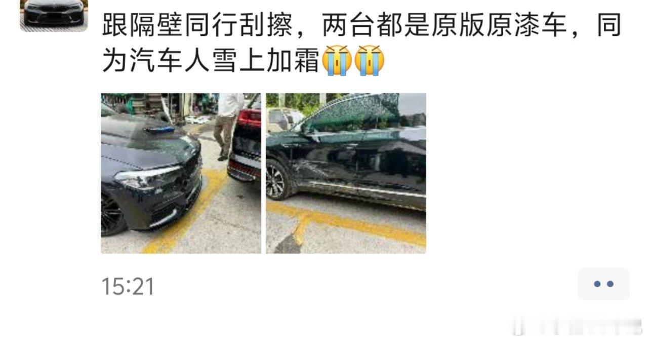 中午揽境安排让代办过户的哥们开去办理颜色变更,结果刚出后门就和隔壁的同行刮上了,原本两台原版原漆的车,现在至少得喷漆两个面,万幸的是两台车都有保险,现在出的是5系的险,目前维修方案是换右侧前叶子板和两个门的膜,以及前叶子板和右侧车门的钣金喷漆,揽境被这一下得少卖个大几千块钱。过户的兄弟也有点过意不去,转了1000给我还要帮我免除这台车过户和变更颜色的费用,也算是以表歉意了,虽然这点钱和实际损失还有点差异,但是也算是有心了,毕竟每台车过户的费用他们也只有个百来块钱的利润,还得上门开车啥的,这1000我就给他退回去没收,让他帮我免除这台车的费用就好大概他的成本也就两三百。这台揽境下午直接批发给外地同行了,省的在我这发出去是原版原漆状态,接着又改成有钣金喷漆这样也不大好,总归没亏钱就是少了一大块利润,也算是谁都没有损失吧。至于那台5系是隔壁同行自己的代步车,他也比较无所谓,一个前杠和车牌喷个漆也就搞定了,机盖一点点掉漆点下就行也不喷漆。