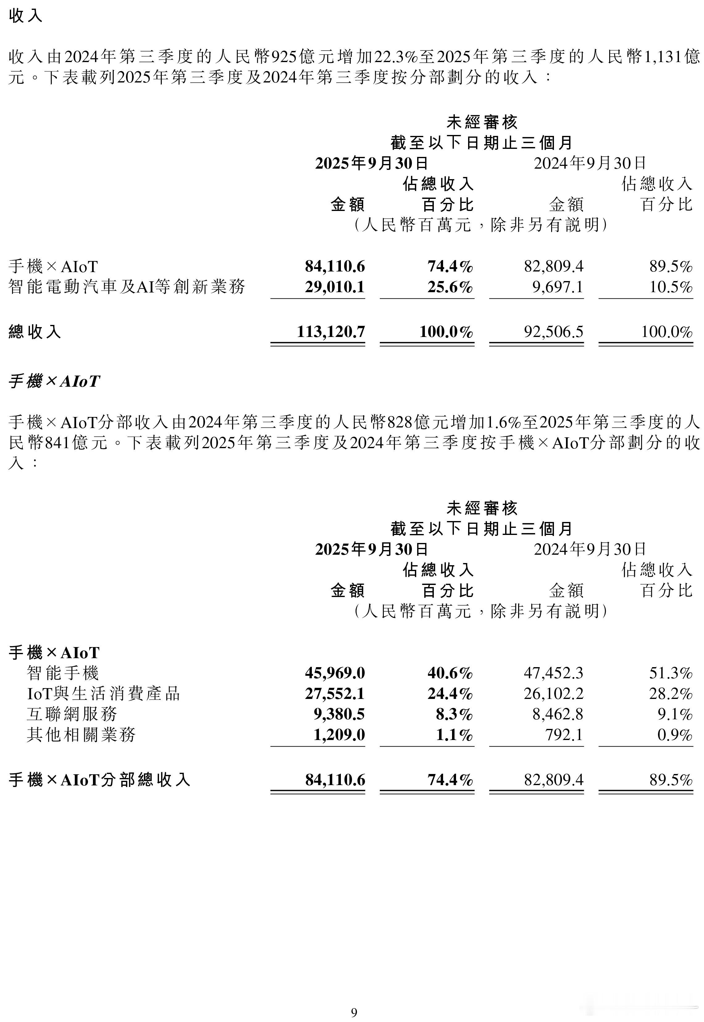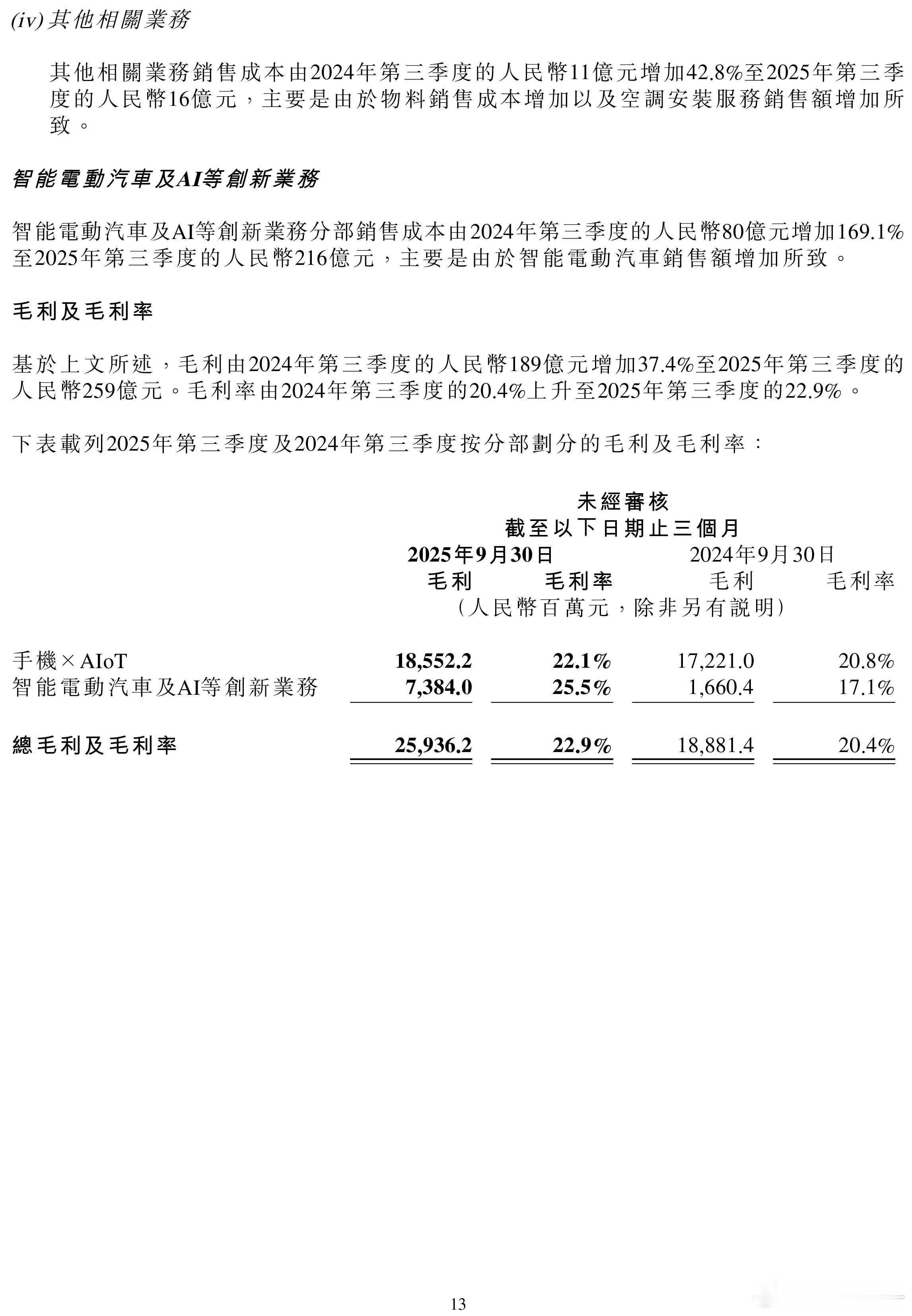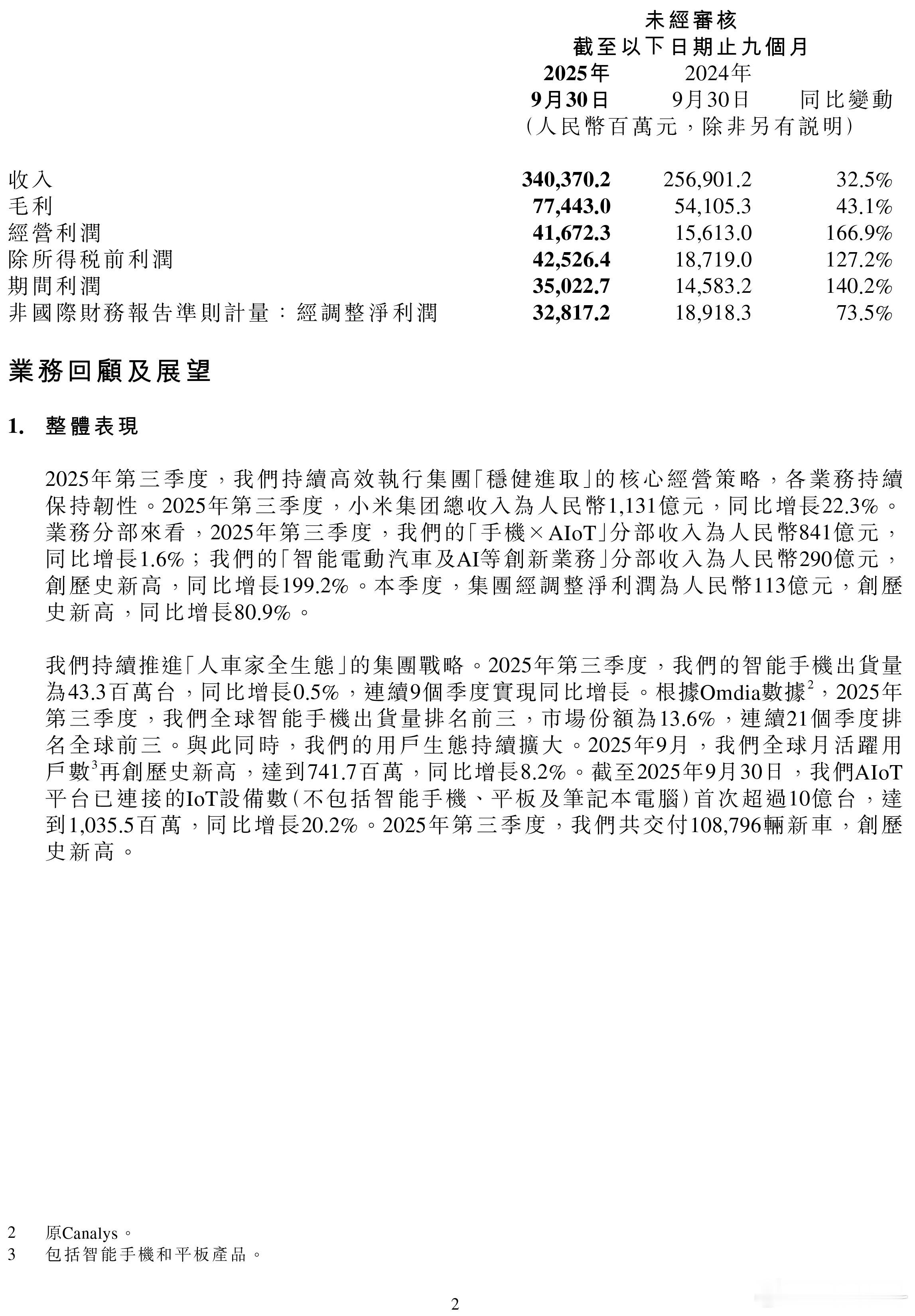 小米集团2025年第三季度营业收入1131.21亿元,同比增长22.3%经调整净利润113.11亿元,同比增长80.9%2025年前三季度营业收入3403.7亿元,同比增长32.5%经调整净利润328.17亿元,同比增长73.5%智能电动汽车及AI等创新业务毛利率从去年同期的17.1%上升到25.5%