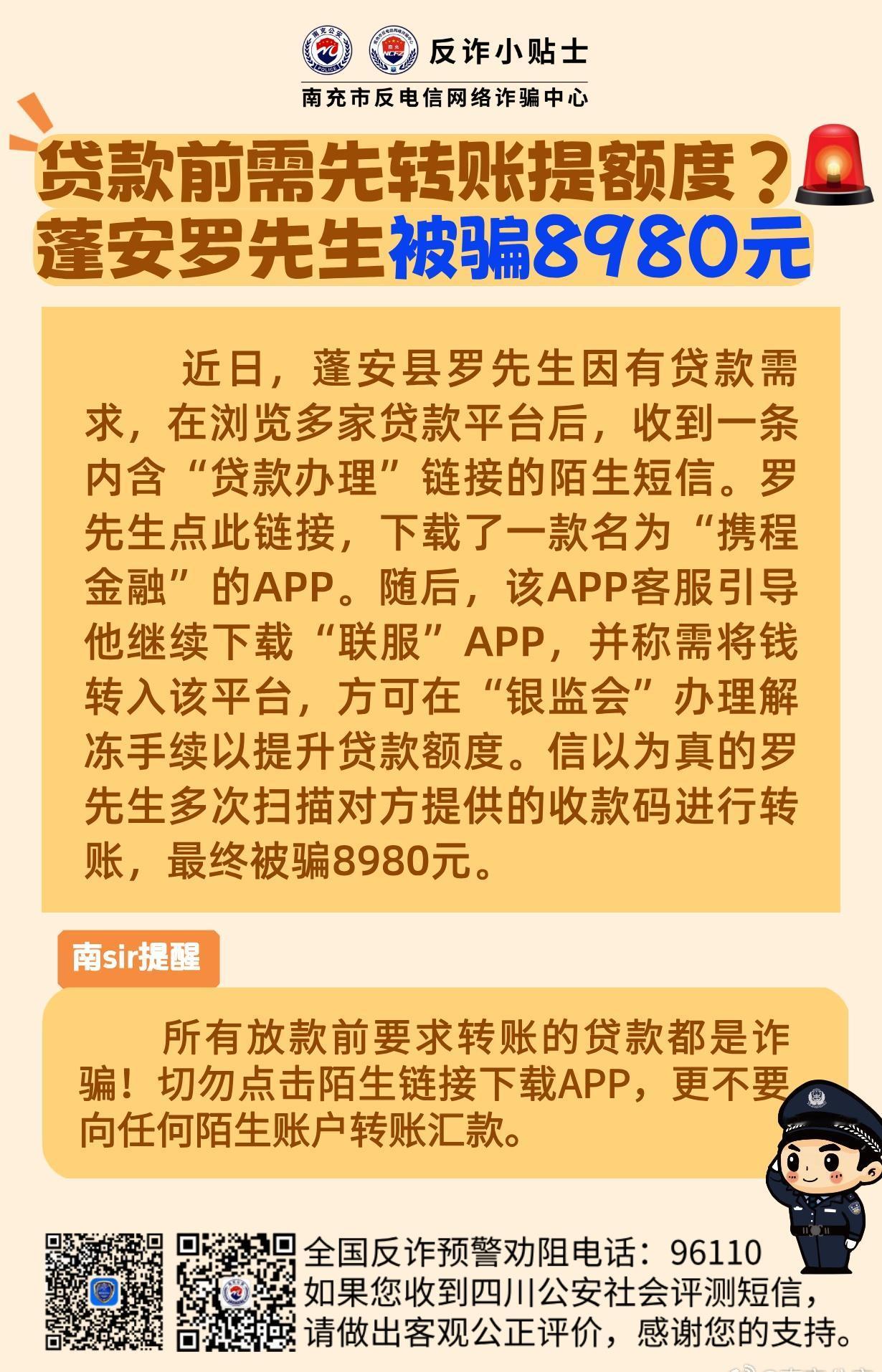 【贷款前需先转账提额度?蓬安罗先生被骗8980元】诈骗看似遥远,实则就在身边。了解才能防范,有印象才能警惕 电信诈骗剑指诈骗