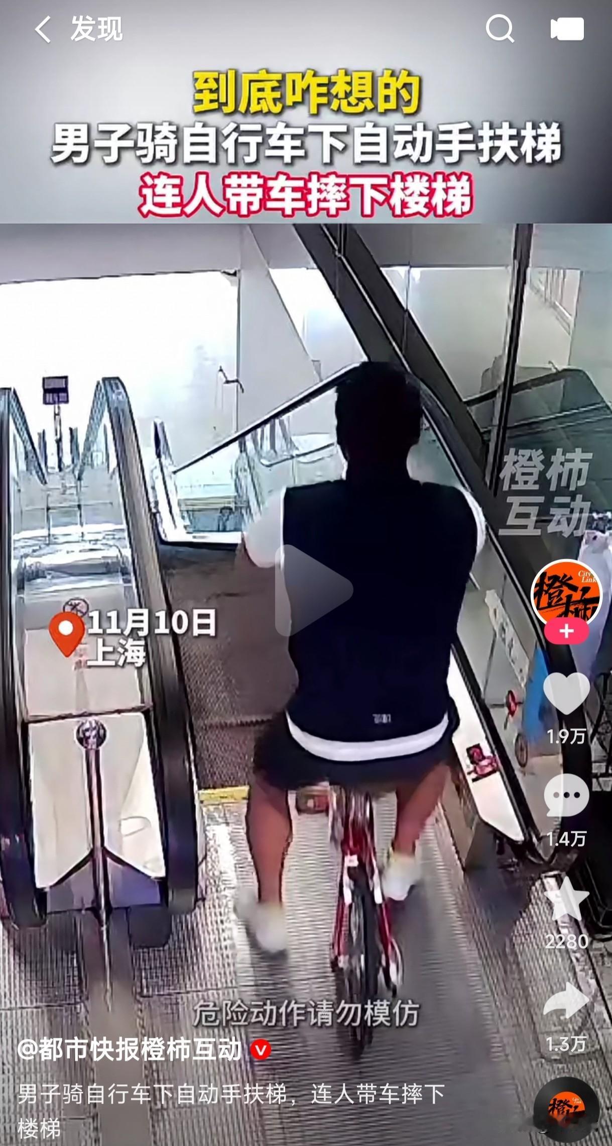 这到底是咋想的? 是不是该锻炼一下脑子了?男子骑自行车下自动手扶梯,没成想连人带车一起给摔下去了。 这是童心未泯想体验一下儿时被摔的感觉,还是这男子脑子有问题,真把电梯当马路了是不是,那么大个人骑着那么大点儿的自行车,不摔你才怪呢? 你好歹一只手扶着自行车,一只手扶着电梯不行吗?还把你自己能的,这摔的一点都不冤,别人骑车锻炼身体,你是不是该锻炼一下脑子了?如过把人家电梯砸坏了,你是不是该给人家赔偿电梯了?