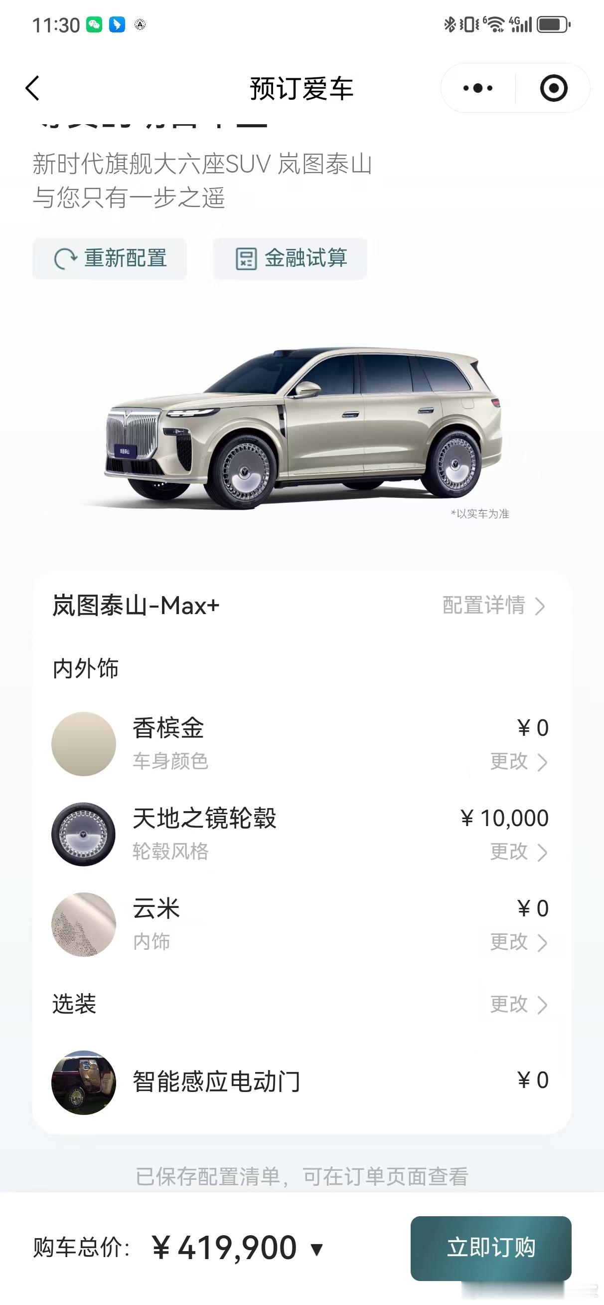 苦等两个月的大家伙终于上市了,今天下午还和同事猜最终价格是37到45,刨去黑武士版,基本猜对了99%因为对后轮转向有刚需,所以综合考虑MAX+更符合我的需求。没选双拼色,选的更低调优雅的香槟+大饼轮。关键还免费升级电动门,这可太香了着实有点迫不及待提车了