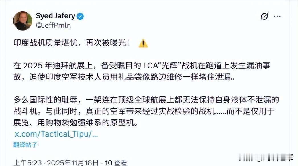 丢人!迪拜航展上,印度光辉战机漏油,网友嘲讽,看到枭龙吓尿了。不愧是印度的战机,