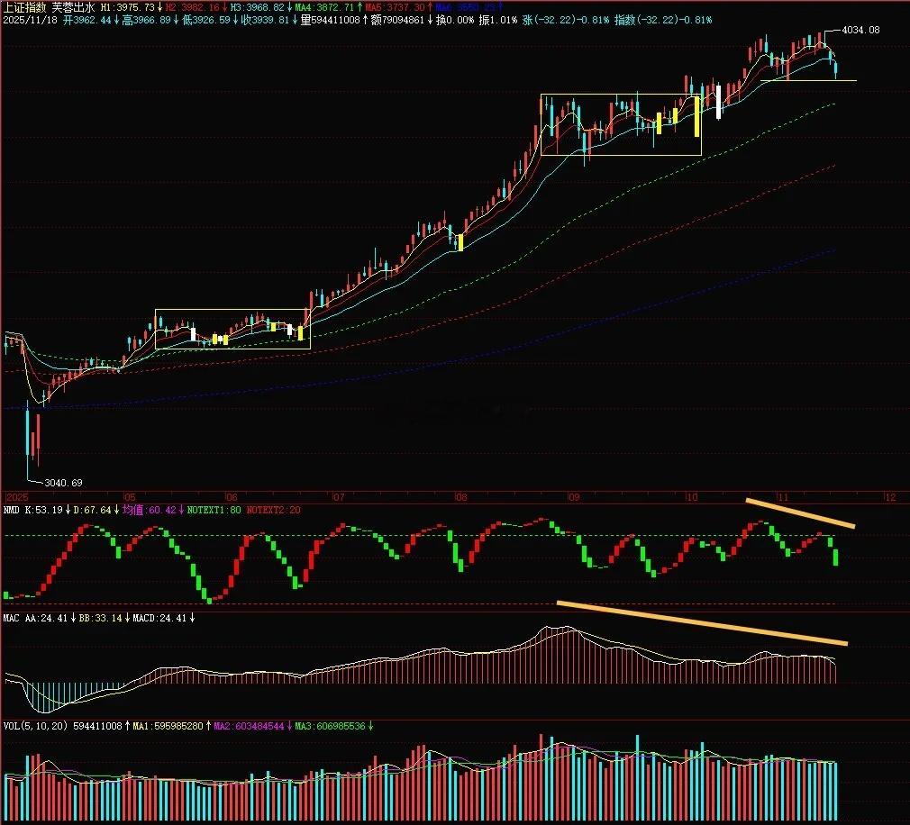 盘后,AI应用利好来袭!大盘今日低开低走,跌破了EMA20均线,逼近小颈线位3922点。目前诺曼底指标出现小顶背离,MACD出现大顶背离,颈线位一旦跌破收不回来,阶段顶就成立了,第5小浪确认完结。要想解除这个风险,明天大盘得阳包阴。盘面上,今日绝大部分股票下跌,只有AI应用相对比较强势,蓝色光标、值得买、视觉中国、浪潮软件、榕基软件等涨幅居前。尤其是蓝色光标、三六零的成交额涨到了百亿元附近,进入了A股成交榜的前十强。这是个强势信号,每个板块成长为主线时,板块里吸引力最大的个股的成交额,都会进入前十名。国庆节以来,资金多次往AI应用方向切,都切换失败了。就在市场失望时,这次在巴菲特、谷歌、阿里巴巴的助攻下,它们又悄然走出了主线潜质。它能取代新能源的主线地位吗?值得关注。锂矿股今日领跌两市,六氟磷酸锂经过两个多月的爆炒,今天在总龙头天际股份的跌停中正式退潮。多氟多、天赐材料、石大胜华、华盛锂电、新宙邦、万润新能等跌停或跌超10%。消息面上,传闻阳光电源与宁德时代在储能上打起了价格战,阳光电源降价30%,报价跌破1.2元/Wh,宁德时代反击至1.15元/Wh。盘后,这个传闻被辟谣了,目前各家官网储能价格也还维持原价,并没有内卷。六氟磷酸锂的炒作今天退潮了,它们想要直接复活,难度很大,反倒是受到拖累不严重的锂矿股值得关注,尤其是走出了上涨趋势的个股,每一次回调都是加仓机会。盘后消息面:1、华为官宣!对标英伟达的AI突破性技术将于11月21日在上海揭晓,正式发布并开源创新AI容器技术Flex:ai,助力算力资源的利用效率。2、宁德时代:当前储能电芯市场需求旺盛,产能利用率饱满;2027年有望实现全固态电池小批量生产。3、百度Q3财报:首次披露AI业务收入,增速50%超预期。其中,AI云收入同比增长33%,AI应用收入达26亿元,AI原生营销服务收入同比增长262%,达28亿元。这对AI应用是个利好,意味着国产AI应用正在加速“变现”,从概念进入业绩兑现阶段。4、谷歌:新一代AI大模型Gemini 3.0有望在本周登场。据称,该大模型可5秒生成新粗野主义风格网页,一句话搭建动态Windows系统,甚至模拟macOS界面,还能从零创作SVG动画、生成行星3D模拟,甚至辨识手帐本涂鸦。5、上线仅一天,阿里千问App已冲入App Store免费应用总榜前四,排名超越DeepSeek。另外,夸克全面接入千问对话助手,将发布全新AI浏览器,与千问APP形成战略协同。