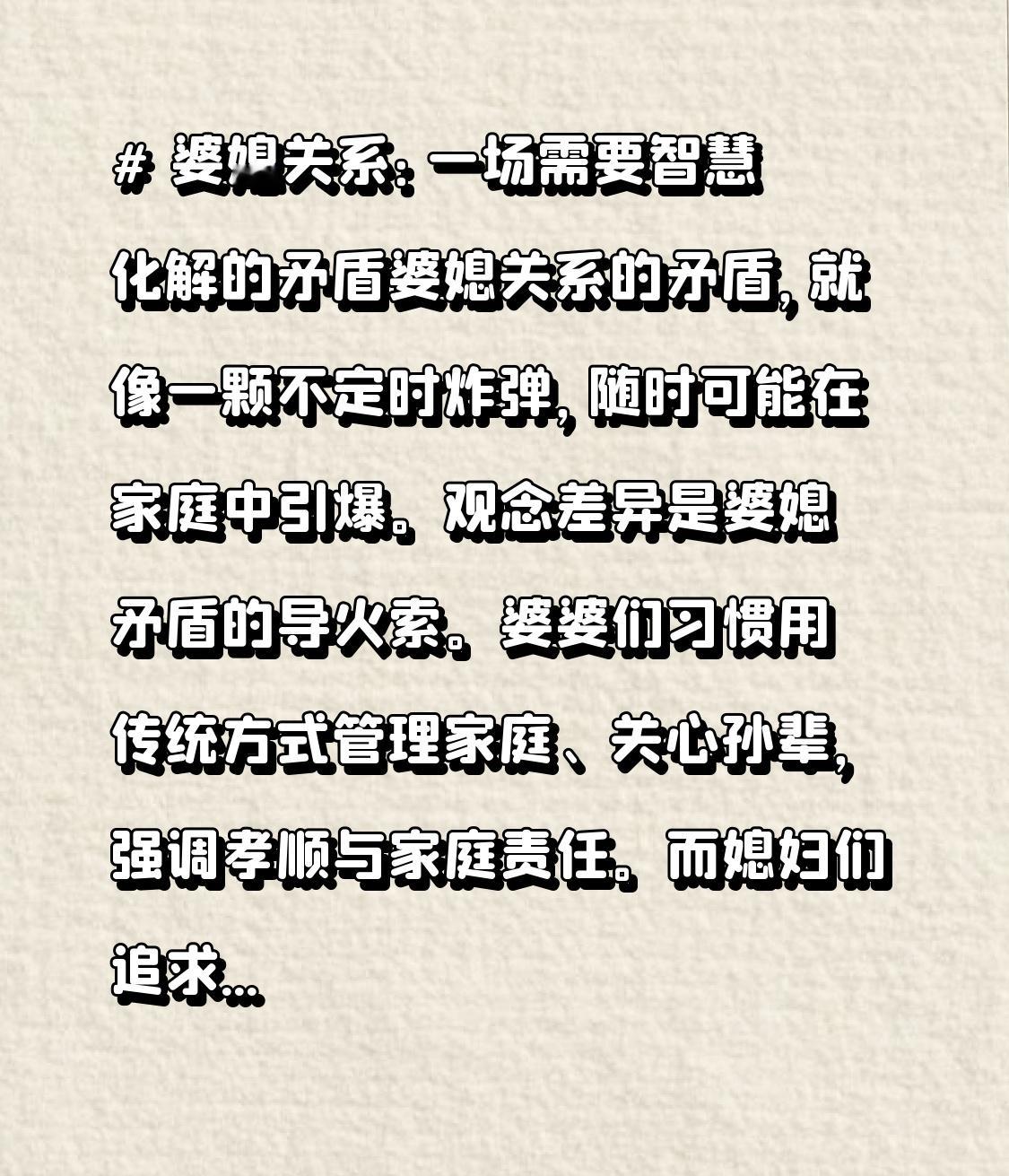 婆媳关系:一场需用智慧化解的矛盾婆媳关系中的矛盾,宛如一颗不定时炸弹...