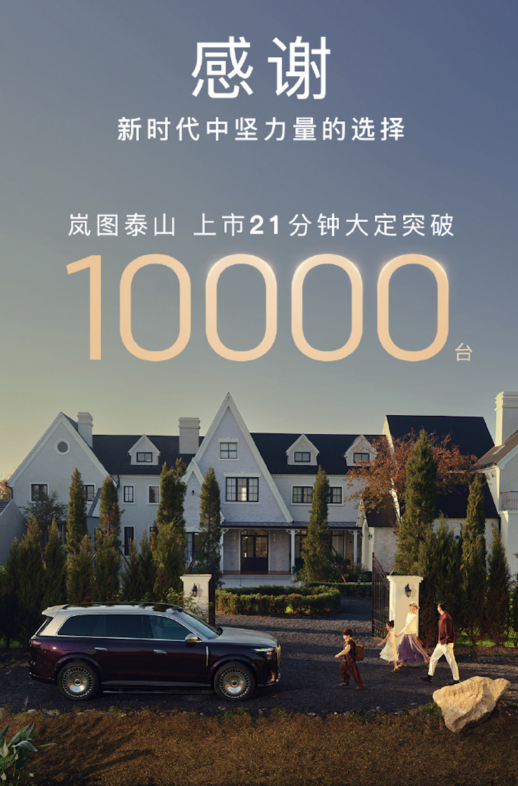 上市21分钟,大定就突破了1万辆。岚图泰山开门红,市场热度相当可以。这车强的很全面,外观及其霸气,内饰很有中国文化色彩;搭载顶级华为ADS4智驾和鸿蒙座舱;配备双向16度后轮转向、三腔空悬;纯电续航350公里,综合续航1400公里。设计、智能化、驾控、动力,统统都是顶尖水平。起步价就37.99万,竞争力很强悍!
