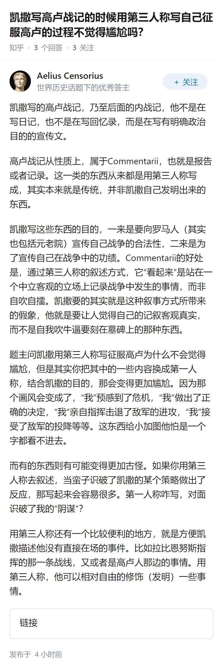 凯撒写高卢战记的时候用第三人称写自己征服高卢的过程不觉得尴尬吗? 我看到里面凯撒