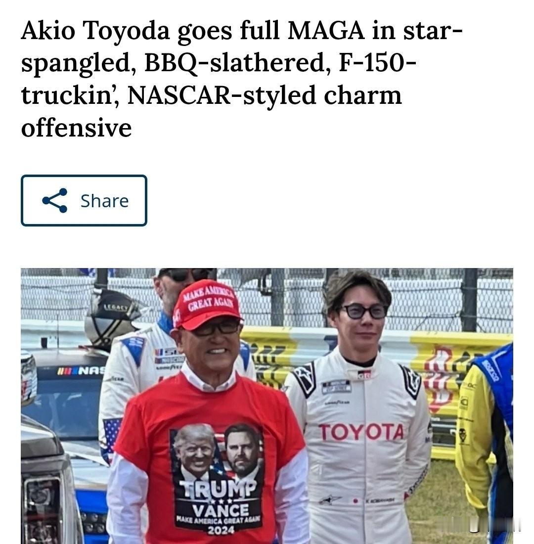 丰田汽车公司董事长丰田章男(Akio Toyoda)确实穿着全套MAGA(“让美国再次伟大”)装备在日本富士赛道(Fuji Speedway)的一次纳斯卡(NASCAR)主题活动中亮相。 这场活动被宣传为美国汽车文化在日本的国际庆祝活动,旨在强调日本对美国汽车的喜爱,并且正值美国征收关税以及丰田宣布对美国进行新投资之际。 丰田章男戴着经典的红色“Make America Great Again”帽子,并穿着印有唐纳德·特朗普(Donald Trump)和J.D.万斯(J.D. Vance)头像的红色竞选T恤。 这一举动引起了广泛关注和争议,一些观察人士和公司内部人士对此感到惊讶或困惑,认为此举有卷入美国政治纠纷的风险。美国驻日本大使乔治·格拉斯(George Glass)也出席了此次活动。