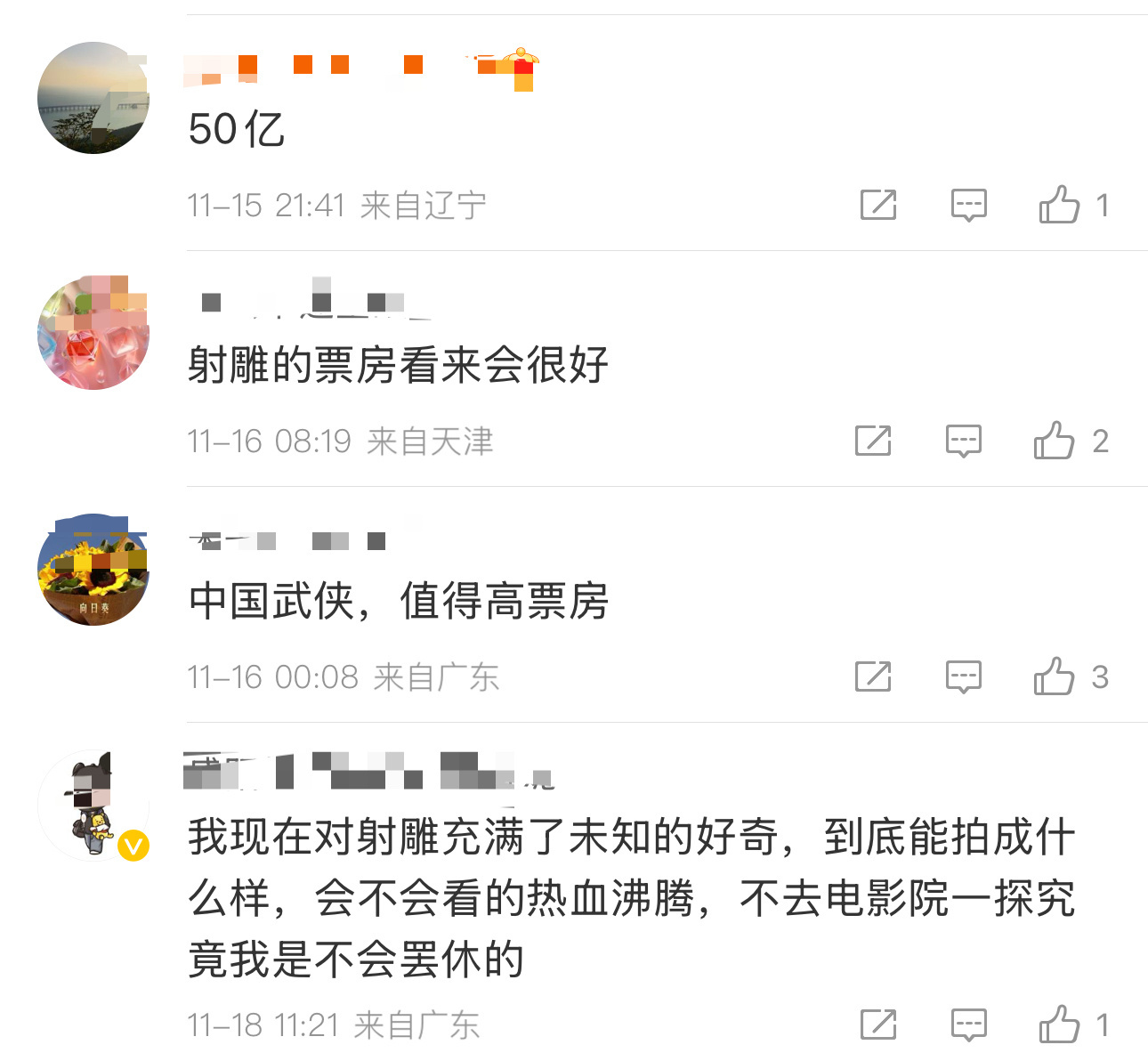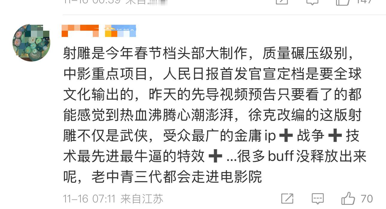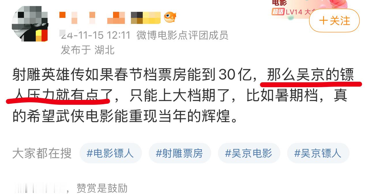去年传射雕定档春节档的时候的粉丝言论《吴京有压力了》