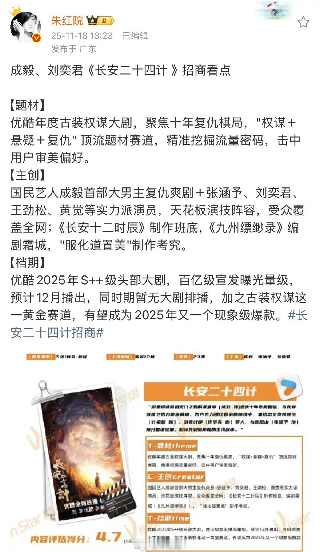 成毅的《长安二十四计 》开始播前招商了,预计12月抬~成毅现在播剧不灵了,不看好长安二十四计,酷又要押错宝了。大家压扑还是爆?