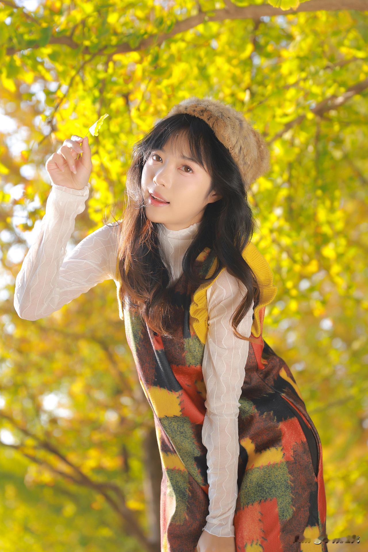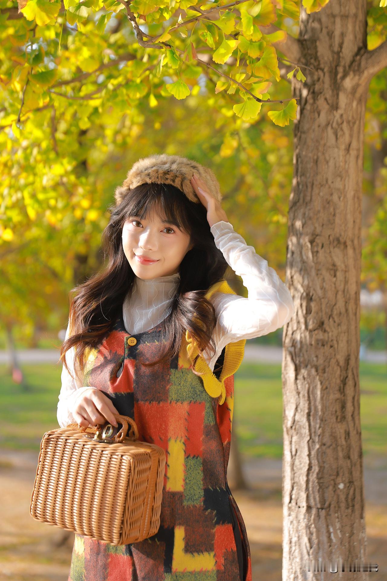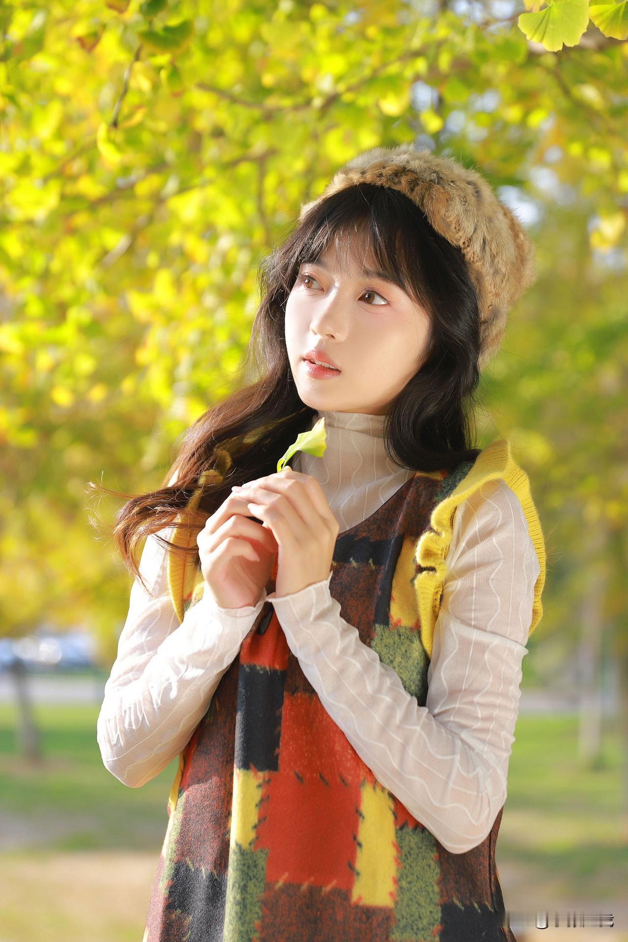 秋风揉碎了银杏的金黄, 都落在了发梢和裙摆上。 暖棕色的毛帽裹着暖暖的阳光, 格子裙仿佛就是焦糖与秋林的配色, 藤编包还沾着晨间的些许凉意。 指尖捻着银杏叶, 懒懒地靠在树旁, 光斑正顺着衣褶漫延开来。 连风都慢下来—— 这就是独属于秋日的松弛, 把日常酿成了裹着桂香的甜酒。 银杏叶写真