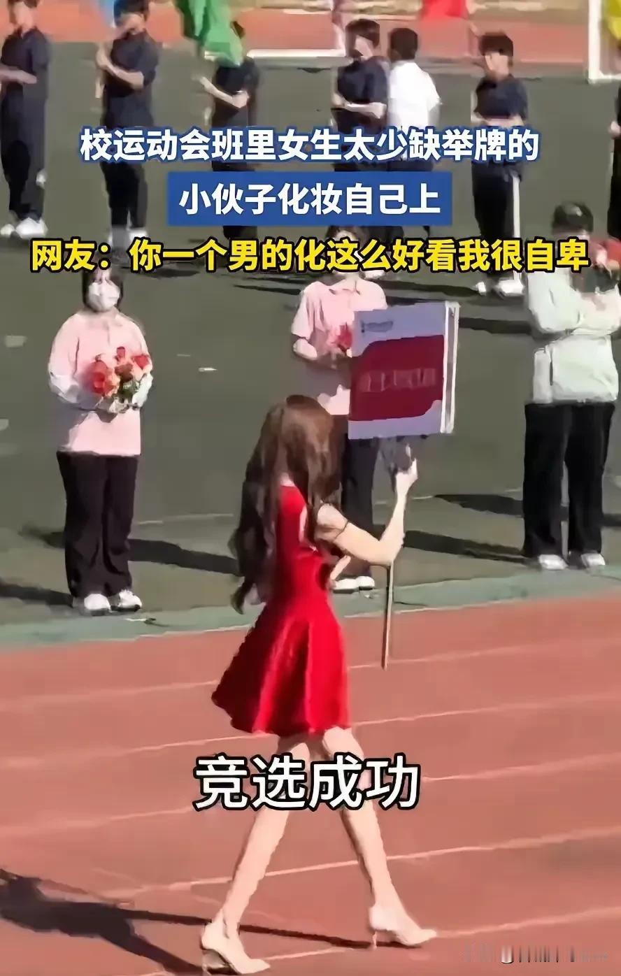 笑死了!广东,一学校举办运动会,但因为班里面女生太少,谁来举牌成了一个大难题,一男生主动请缨,化完妆后自己上场举牌,结果硬是没让人看出来他是假扮的,网友:我一个女的看完都自卑了 你可能没细想过,学校运动会的举牌手,好像默认就该是女生来当。不是有什么规定,就是大家习惯了——要穿统一的裙子,要走得挺拔又带点灵气,再配上简单的妆容,往队伍最前面一站,看着就清爽。 可这个班偏偏卡了壳,女生总共就那么几个,要么要参加跑步项目,要么怯生生说“不敢站那么前面”,班委凑在一起商量半天,越说越着急,运动会开幕式第二天就到了,总不能让班级方阵少了举牌的环节吧? 就在大家围着黑板叹气的时候,后排一个男生突然举手了。声音不算大,但整个教室一下子静下来,连正在翻找服装的女生都停下了手。 他说“要不我来试试?”,话音刚落,班里先爆发出一阵笑,有人拍着桌子说“你?别开玩笑了,举牌要穿裙子的!”,还有人担心“你化了妆会不会很奇怪?”。 男生没反驳,就是挠挠头说“裙子能改改腰围吧?化妆不是有女生会吗?总比没人举牌强”。 这话一出,班里的气氛就变了。之前调侃的人也闭了嘴,几个会化妆的女生主动凑过来,说“我有粉底液,能给你遮遮痘印”“我带了眉笔,给你修个细点的眉形就行”。 当天下午放学,教室后排就成了临时“化妆间”,男生坐在椅子上,腰板挺得笔直,任由女生们在他脸上忙活。有人给他涂隔离的时候,他还忍不住眨眼睛,惹得周围人笑,他自己也红了耳朵,却没说一句“算了”。 粉底选的是接近他肤色的自然款,没往白了涂;眉笔用的是浅棕色,顺着他原本的眉形修得稍微弯一点,没画成细挑眉;口红就更淡了,是接近唇色的豆沙色,只轻轻抹了一层,连唇线都没勾。 女生们还特意找了条浅蓝色的举牌裙,找针线把腰围放大了两圈,又在腰后别了个隐形夹子,确保他穿起来不紧绷。试穿的时候,男生站在镜子前,自己都愣了几秒,小声说“好像……真没那么怪”。 之后的半小时,他还跟着女生学站姿——肩膀要放松,手举牌的时候高度要齐胸,走路的时候步子别太大,要稳。一开始走得磕磕绊绊,总觉得手脚不协调,练了几遍后,慢慢找到了感觉,连笑容都自然了不少,不再是硬挤出来的。 运动会开幕式那天,这个男生举着班级牌子走在最前面。红色的裙子随风飘着,他抬头挺胸,脸上带着淡淡的笑,步伐不快不慢,跟在后面的方阵同学都憋着笑,却又忍不住自豪。 旁边班级的老师还拉着他们班班主任说“你们班这个举牌女生气质真好,站姿特别稳”,班主任笑着没拆穿,直到走完方阵,男生把牌子递给同学,摘下头上的发夹(女生特意给他夹了个小发卡遮发际线),周围才有人惊呼“原来这是男生啊?”,连裁判老师都凑过来看了两眼,说“没看出来,妆容和状态都很自然”。 这段举牌的视频被同学发到网上,评论区一下子热闹起来。有人说“我一个女的看完都自卑了”,这话不是真的自卑,是带着调侃的肯定——没人觉得男生化妆举牌“娘”,反而都在夸他“有担当”“为了班级愿意尝试”。还有人说“现在的学生真不一样了,换以前哪有男生愿意干这个”,这话倒是说到了点子上。 以前大家总觉得,举牌、化妆这些事“就该女生来”,男生沾了就会被说“不正常”,可在这个班,没人纠结这些,大家先想的是“怎么解决问题”,男生主动站出来,女生帮忙化妆改裙子,都是为了让班级方阵能完整亮相。 这事儿看着好笑,背后其实藏着挺暖的道理。不是说举牌一定要男生来做,而是遇到困难的时候,没人被“性别该做什么”的标签捆住。 广东的校园里向来不缺这种务实劲儿——不纠结虚的,先把事儿办好。女生少就找男生帮忙,不会化妆就一起学,没有谁觉得“这不是我该干的”,反而都想着“咱们班不能掉链子”。这种凝聚力,比谁来举牌、举得好不好看,更让人印象深刻。 说到底,运动会的意义从来不是比谁的举牌手更“标准”,而是班级里的人能一起出力,一起为一件事努力。 这个男生打破的不只是“举牌手是女生”的习惯,更是那种“男生不能做这些事”的刻板印象。只要是为了集体,愿意放下顾虑去尝试,这样的举动,比任何精致的妆容都更打动人。 各位读者你们怎么看?欢迎在评论区讨论。
