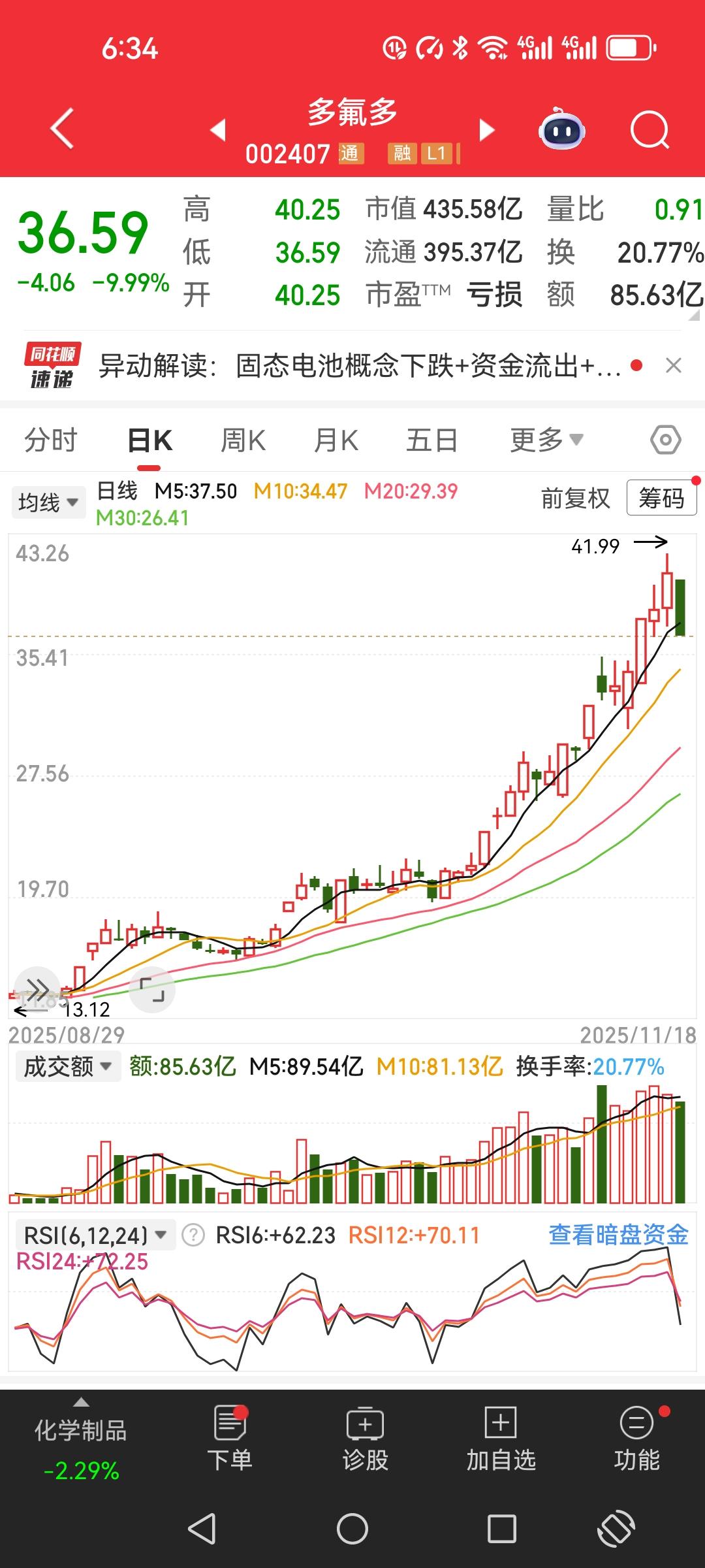 这真是“追涨”的标准版。 跟大家说个我炒股的糗事,17号看好多氟多这只股票,已经连续涨了好几天了,非常强势,想做个短线。 17号早上38.38高开,我没急着买,想着先看看。等到下午,眼瞅着它开始拉升,冲到41块以上,马上要涨停了!我一下子没忍住,赶紧在41块挂单买入。 成交后还真涨了起来,最高冲到涨幅9.6%,差一点点就涨停了,我当时心里还还美滋滋的。结果到尾盘,涨幅只剩6%,收在40.65。当天就套了0.35。 本来想着第二天能涨回来,结果低开0.1,就直接下滑,连个像样的反弹都没有,来回磨蹭到尾盘,居然跌停了!收盘36.59。 就这么一天的时间,一万多块钱没了……真是手快剁手,贪心不得,这学费交得心疼。都是追涨也得祸。氟化工概念股 头号创作者激励计划 头号创作者激励计划 头号创作者激励计划