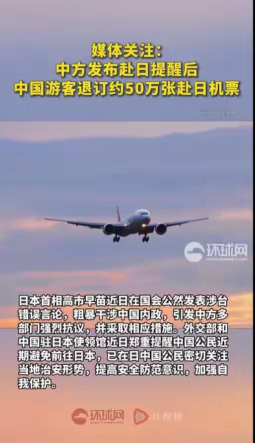 日本这下可摊上大事了!日本首相高市早苗公然发表涉台错误言论,严重干涉中国内政,这下可把中国民众给惹恼了。 自11月15日以来,中国各大航空公司已有约50万张赴日机票被退订,占飞往日本总预定量的32%,这可是2020年初以来最大规模的机票退改事件。 要知道,中国一直是日本重要的游客来源国,这一变化对日本旅游业的冲击可想而知,日本零售和旅游公司股价都应声暴跌。有分析师预测,若中国游客数量减半,日本GDP增速可能会下降0.2个百分点。只能说,这是日本自食恶果,谁让他们触碰中国底线呢!