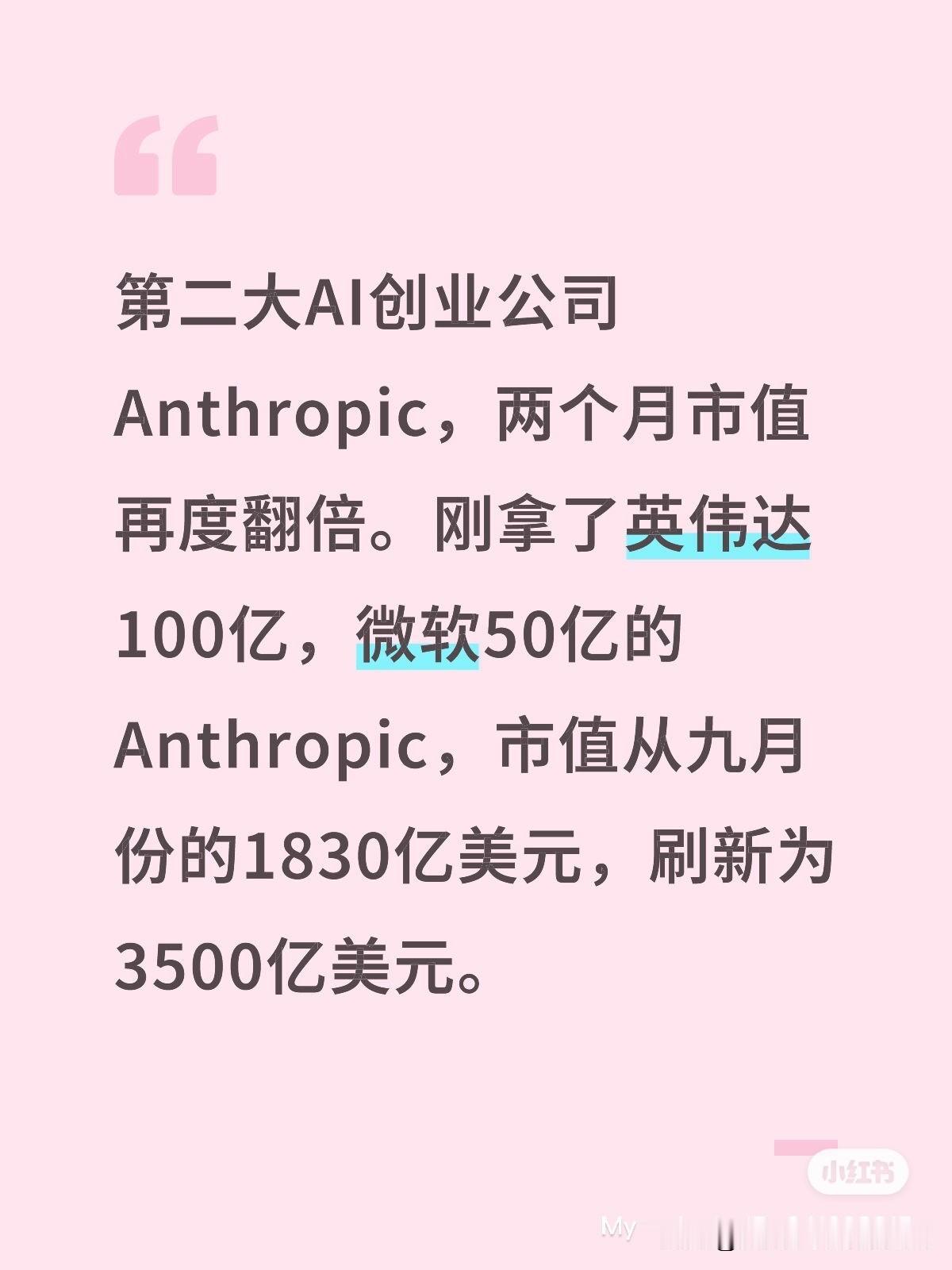 第二大AI创业公司Anthropic,两个月市值再度翻倍。刚拿了英伟达100亿,微软50亿的Anthropic,市值从九月份的1830亿美元,刷新为3500亿美元。AI价值重估 AI市场分析 AI行业巨擘 AI市场巨变 ai芯片公司 ai价值榜 ai技术公司 全球ai企业 anthropic 英伟达