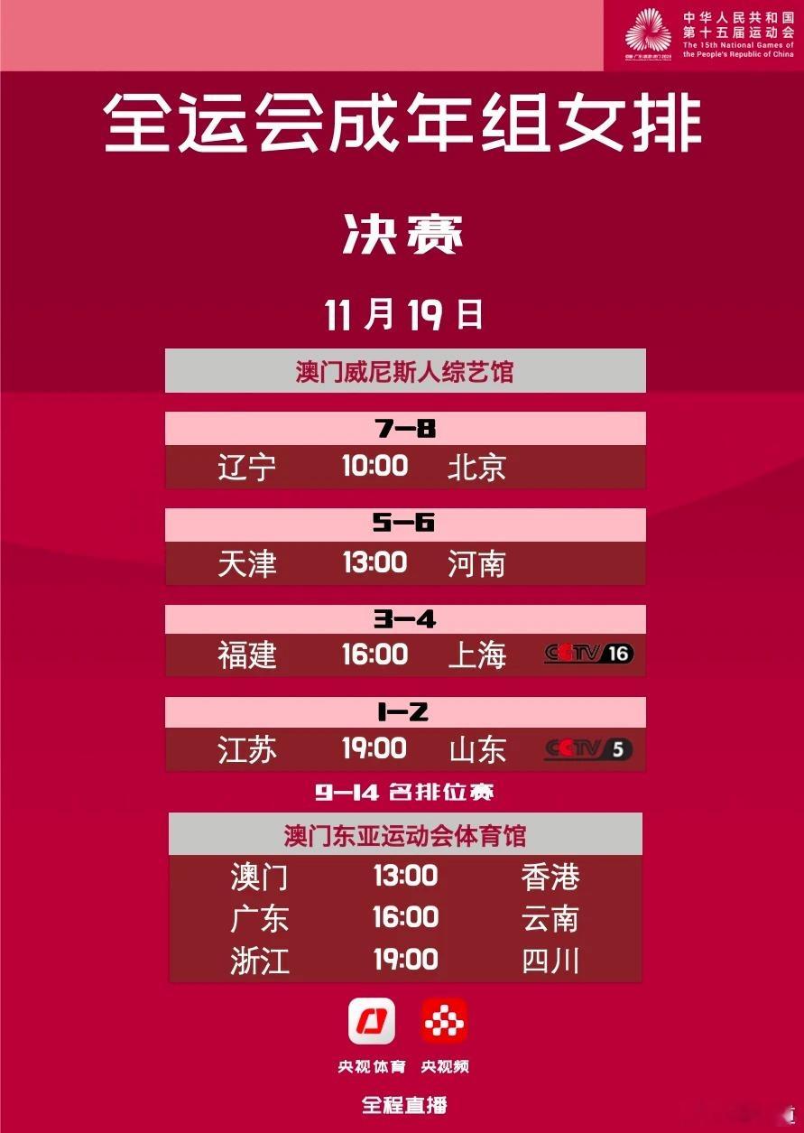 11月19日,女排成年组最终日赛程 10:00 女子成年组 7-8 名决赛:辽宁 vs 北京13:00 女子成年组 5-6 名决赛:天津 vs 河南16:00 女子成年组 3-4 名决赛:福建 vs 上海19:00 女子成年组冠亚军决赛:江苏 vs 山东 C组(9-14名) 13:00 女子成年组小组赛 C 组:澳门 vs 香港16:00 女子成年组小组赛 C 组:广东 vs 云南19:00 女子成年组小组赛 C 组:浙江 vs 四川央视频、央视体育App直播