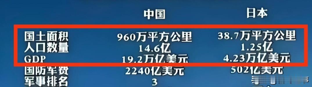 我国与小日本经济对比 1、国土面积:960万&38.7万; 2、人口数量:14.6亿&1.25亿; 3、GDP:19.2万亿&4.23万亿; 4、人均GDP:13150&33840。 从上数据可以看出,小日本不可小觑,国土面积比我们少24倍,但人均GDP却比我们多2.5倍。 我们还需继续努力,当那一天人均GDP超过小日本时,到哪时才会真正把小日本踩在脚下!