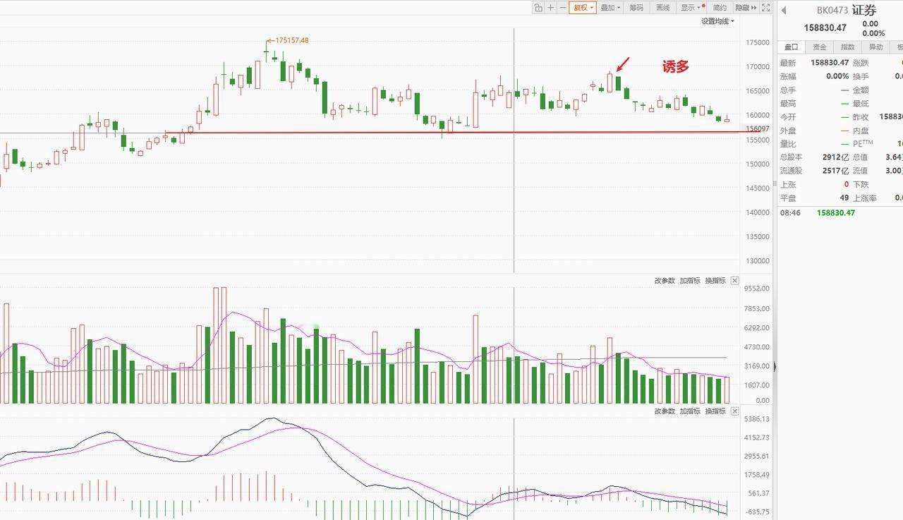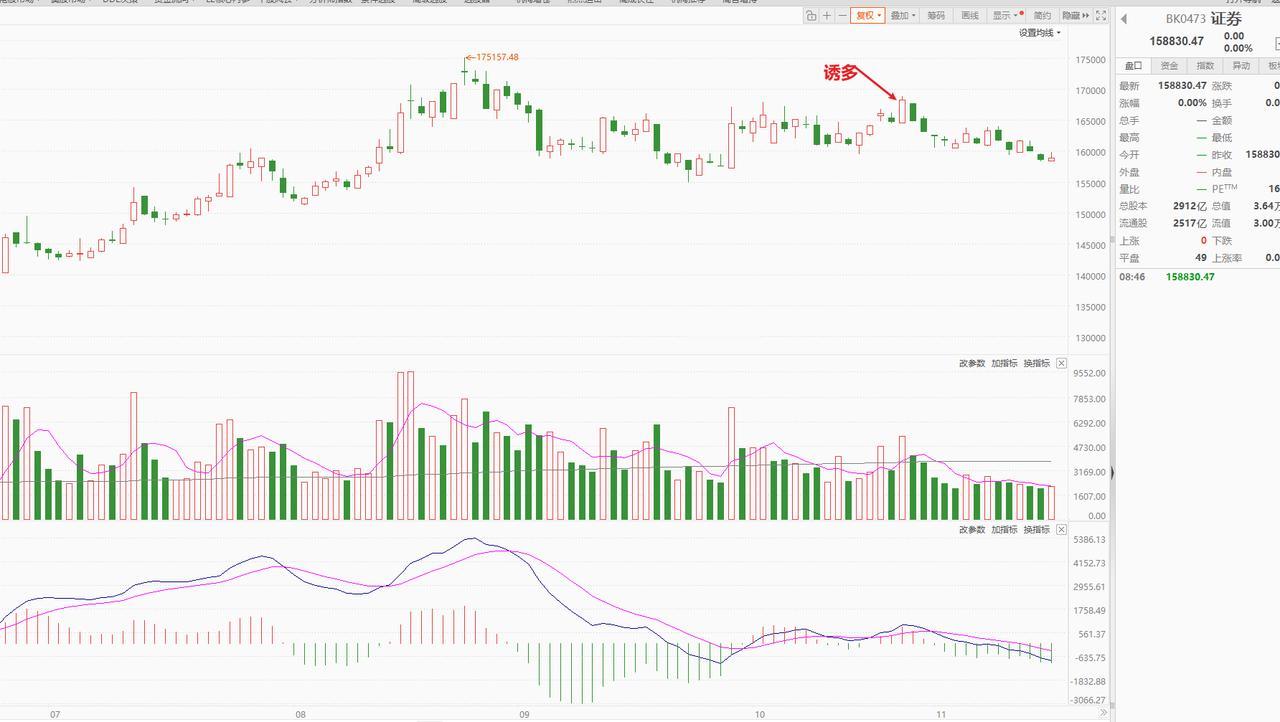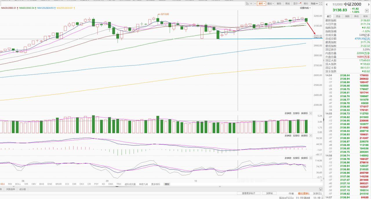 见到这一信号才能抄底! 这波调整还是没有结束的,底部形成大概率是一根长阴。 指数连跌三天,有修复预期,但这个修复也只能权当诱多处理,可有可无。 我暂时先等一根长阴再决定抄底。 从平均价指数看,这波调整是要试探10月17日的低点的,就算不跌破也是极限试探,近期基本是横盘, 从中证2000指数看,比平均价指数更强,昨日才是第一根阴线,算是才开始跌。 但是从盘面看,虽然指数没跌,但个股已经跌了不少了。 这就是轮动,指数阳线,但带动阳线的力量却是不同的,指数阴线,大部分个股一根阴线比一根低。 这样说明没有合力,向上难度很大。只能腾挪,但是当下技术面有连跌的需求,这波下跌和之前的明显不同,这里更具连续性。 这波真正的见底需要看证券! 之前和大家说过,如果这个中期顶部是成立的,那么券商一定有长阴, 10月底诱多之后连续下跌,后续至少是中阴跌破这个红线平台的, 所以这个底部我就等证券板块出现破位下跌。 这个出现了就果断抄底。 目前就是继续观察,等合适的底部。