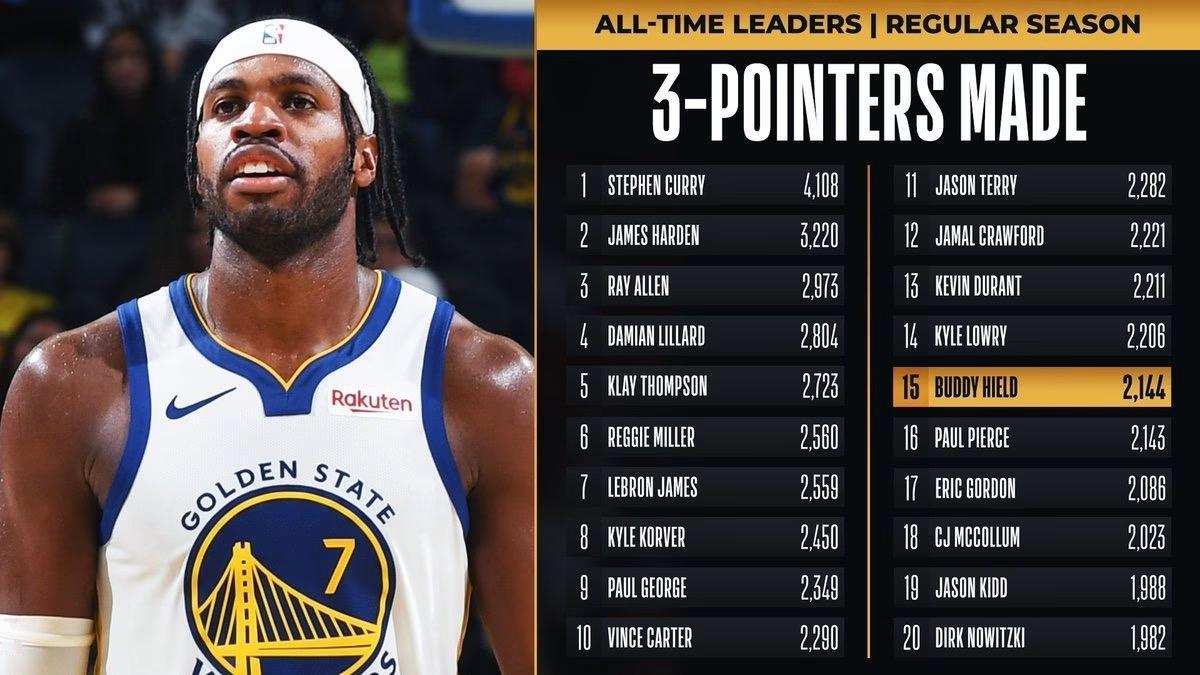恭喜勇士队的巴迪·希尔德在历史三分榜上攀升至第15位!