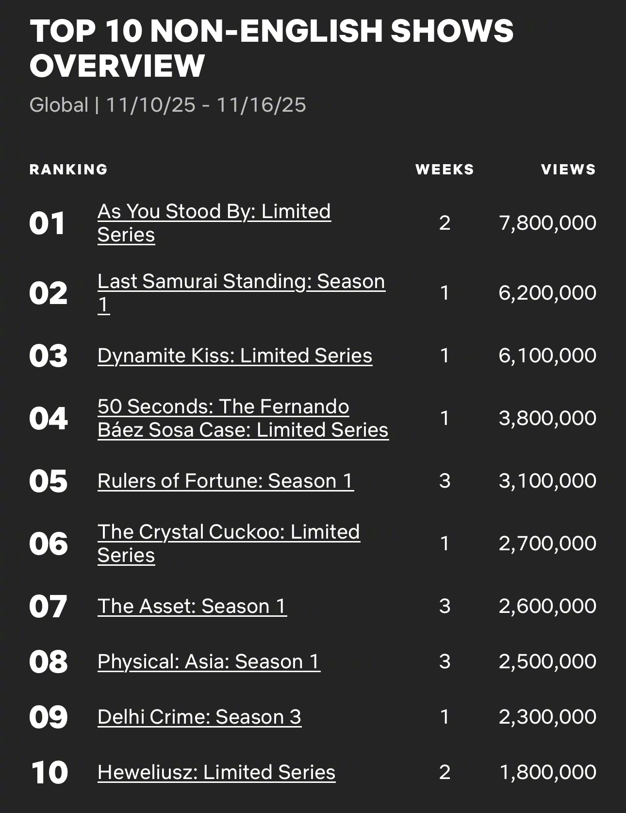 11/10~11/16 Netflix非英语区电视播放量Top10入榜韩剧1 7.8M,第2周🏅3 6.1M,NEW