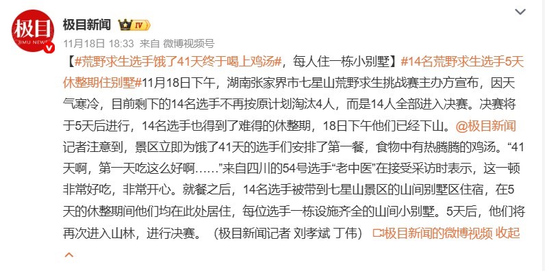 国外类似的荒野求生节目拥有巨大的观众群,湖南张家界借鉴此赛事也是宣传当地的一个好形式,通过连续上热搜吸引了很多网民的目光。这样的比赛很大程度上就是表演,不是真正意义上的野外生存,选手的安全是最主要的。不仅要提防现场出事,也要防止选手后面有事。