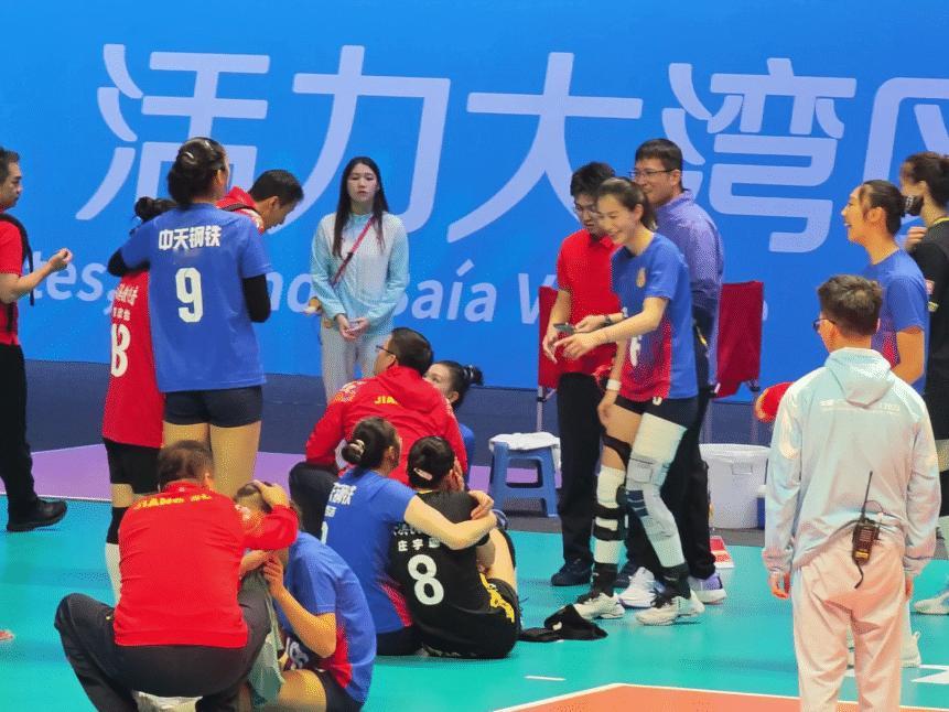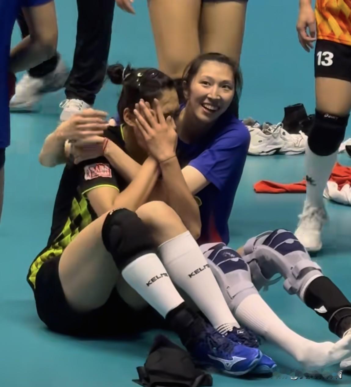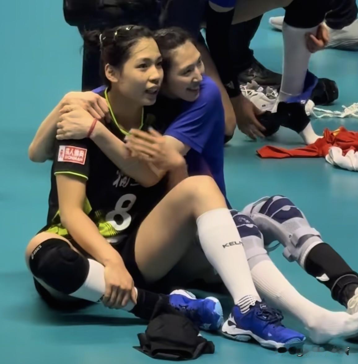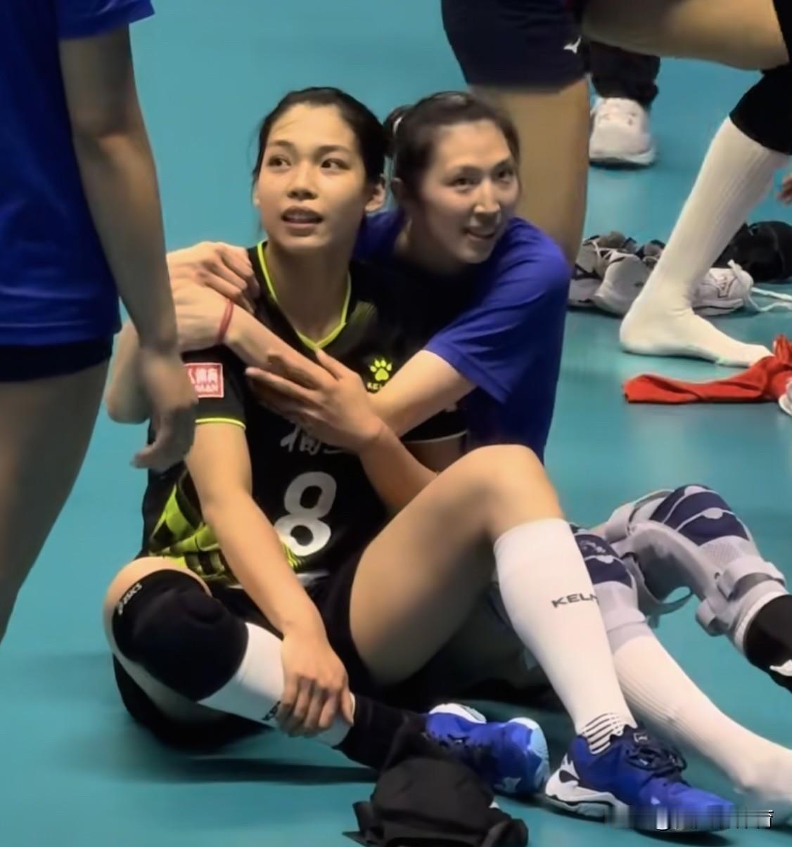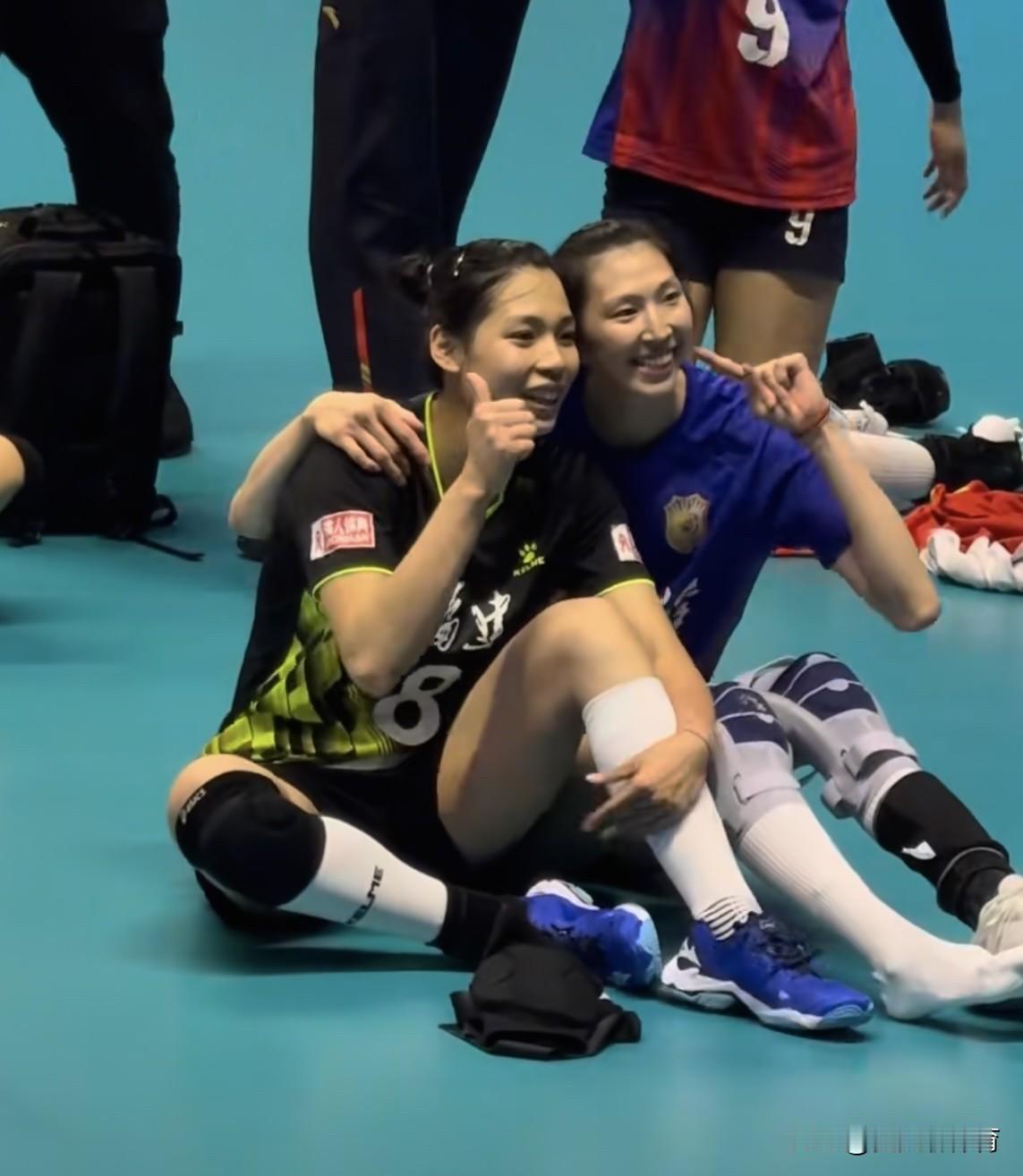 场上是相杀的对手,场下是情同手足的姐妹花!中国女排未来的双子星主攻,庄宇珊和吴梦洁,未来就靠你俩挑大梁了,姐姐们都退了,你们要赶快顶上来啊!打完比赛,俩人就坐在地上,紧紧抱在一起拍照,小吴同学把阿庄抱得紧紧的,刁琳宇过来了,说她们俩人亲亲我我的,阿庄还捂着脸不好意思,害羞了!真是一代人有一代人的小青梅竹马啊,这两位是从青年队一块成长到国家队的姐妹花!