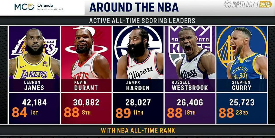 现役历史得分榜,库里不敌威少你敢信? 相比詹姆斯,杜兰特小4岁晚1年进NBA,不是大伤的话,生涯总得分应该跟詹姆斯差不多。 哈登得分能力是真强,这几年场均分降这么多,竟还比威少、库里多。 巅峰的威少真不比库里差;库里则是生涯前期拖累了。 他们这一代还是撑起了美国篮球,现在是国际球员称霸了,哈哈。 按个人喜好,这5人你们会咋排?