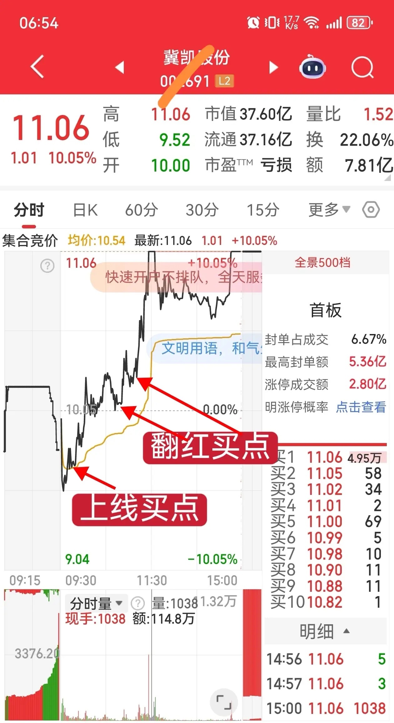 “低开上线翻红”战法。该战法比较适用于早盘(9:05-10:30)的选股与操作,