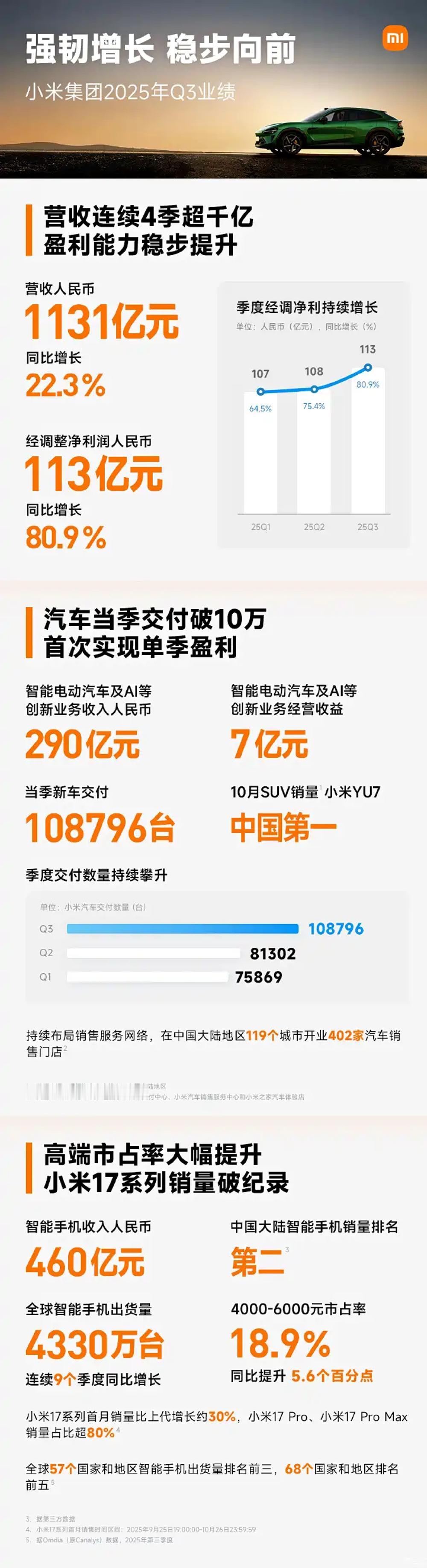 小米2025 Q3财报来了: 智能电动汽车业务单季交付108796台,收入290亿元(同比暴涨199%),更狠的是——首次实现单季盈利![哆啦A梦吃惊] 从“PPT造车”质疑到“交付即赚钱”,小米只用了几个季度: 10万台交付量里,小米YU7直接拿下10月国内SUV销量第一,线下402家门店(覆盖119城)成了“出货加速器”。 新势力还在比“谁烧钱少”,小米已经开始算“赚多少”了[666]