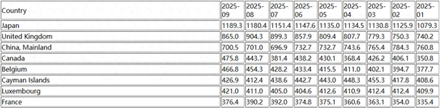 具体来看,日本目前仍是美国国债最大的海外持有国,9月日本持有的美国国债规模达到了1.189万亿美元,创2022年8月以来新高(当时持有量为1.196万亿美元)。目前,日本美债持仓已连续九个月出现增长。