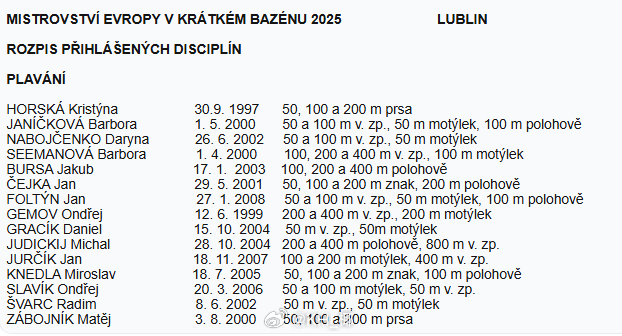 捷克公布参加短池欧锦赛大名单,共15名选手
