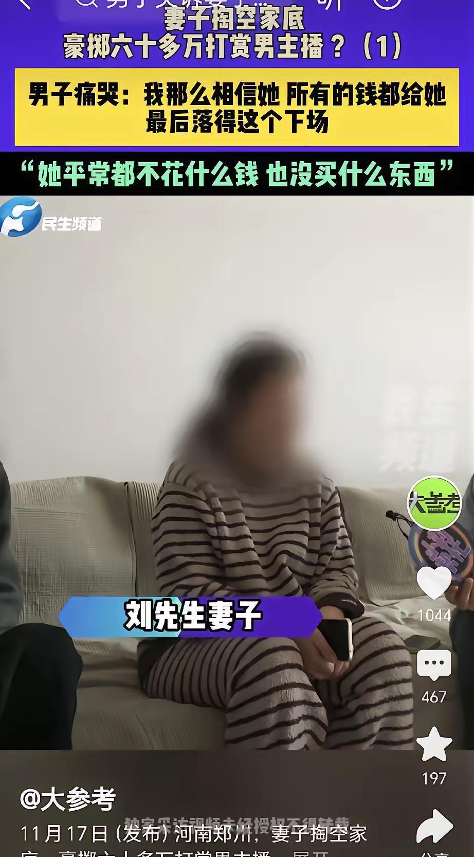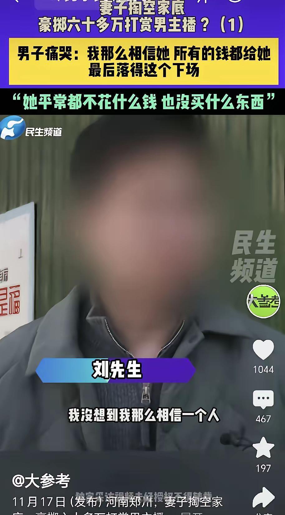 8年攒116万全被妻子打赏男主播!一句"宝宝",毁了整个家? 真的被郑州这事儿气到心梗!30多岁的刘先生在外拼了8年,住300块漏风漏雨的出租屋,省吃俭用攒下116万养家钱,全交给妻子保管,结果查账时只剩3毛钱! 67万被妻子打赏给男主播,剩下的钱说不清楚,还偷偷借了8万网贷接着刷!就因为主播喊了句"宝宝",说"想宝宝一直陪着我",她就上头到停不下来,从几十块刷到几万块,把丈夫的血汗当成讨好外人的筹码。 最讽刺的是,刘先生扛下全家生计,想着供孩子上学、养老人,而妻子在家带娃闲得发慌,却把家庭未来当成直播间的"排面"。这根本不是一时糊涂,是自私到骨子里的拎不清——把伴侣的付出当理所当然,把虚拟的甜言蜜语当真爱,亲手毁了最该珍惜的日子。 夫妻共同财产不是一人的私产,这种挥霍行为既伤感情又违法,刘先生起诉要回钱完全合理。但就算钱能追回,破碎的信任还能补回来吗? 你们觉得这打赏的钱该全额返还吗?如果是你遇到这种情况,会怎么处理?评论区聊聊你的看法!