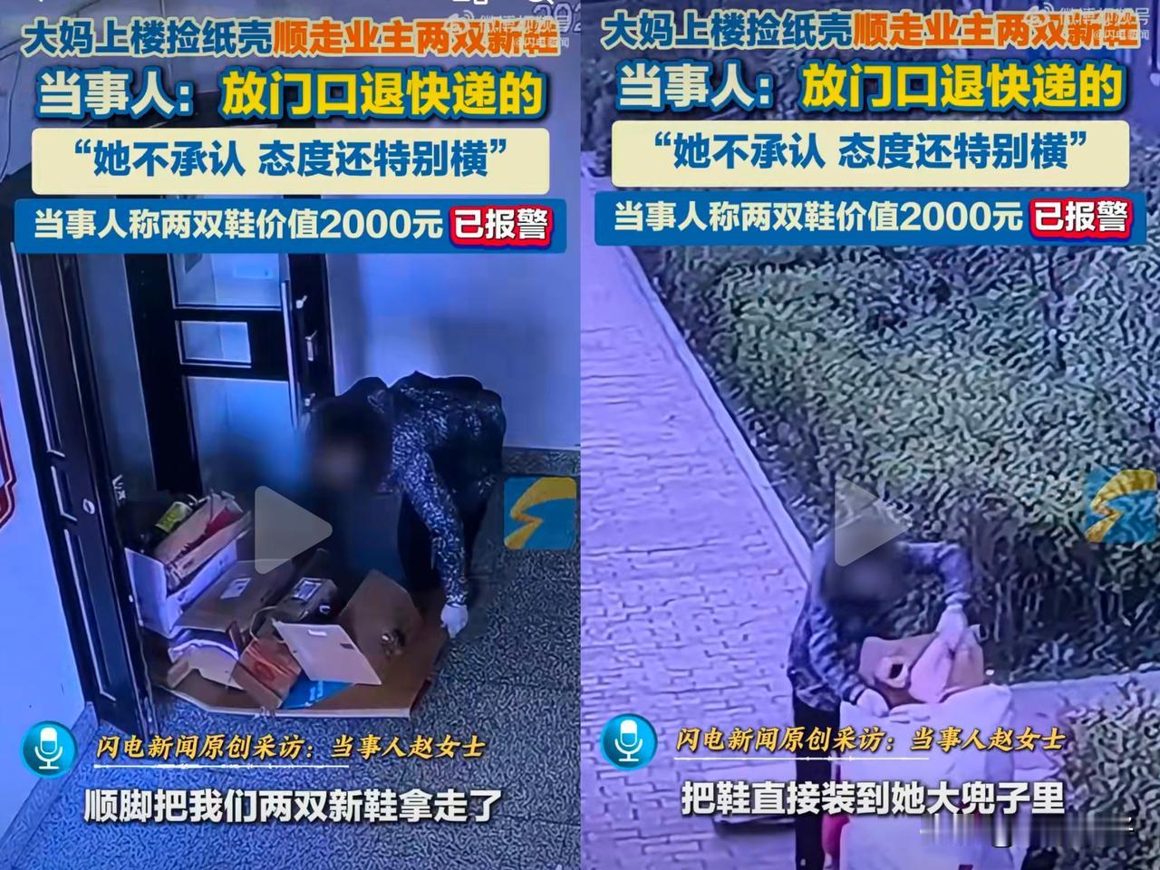 老人捡废品“顺走”业主门口2000元新鞋,女儿女婿回应“可将母亲拘留” 11月14日,吉林松原某小区的赵女士遇到一件烦心事。一位经常出入小区捡纸壳的老人,在捡拾废品时,顺手拿走了她放在门口的两双全新鞋子。 这两双鞋是赵女士准备退货的商品,价值约2000元。发现鞋子不见后,赵女士通过监控录像找到了这位老人。 然而面对确凿的证据,老人却拒不承认。更让赵女士感到无奈的是,当她联系上老人的女儿和女婿时,对方虽然表示“可以将母亲拘留”,但同样没有解决问题的诚意。最终,赵女士选择了报警处理。目前警方已介入调查。 捡废品没问题,捡错了东西还回来也行,但一家人都不认账,破罐子破摔”的态度可见品性。捡纸壳是凭劳动赚钱,顺走别人鞋子性质可不一样,算小偷小摸,价值2000,那直接可以拘留。有些老人根本不是缺钱,就是爱占小便宜。无论年老年少,违法就是违法,恶行就是恶行,不会因年龄而改变,也不能因年龄而得以豁免惩罚。
