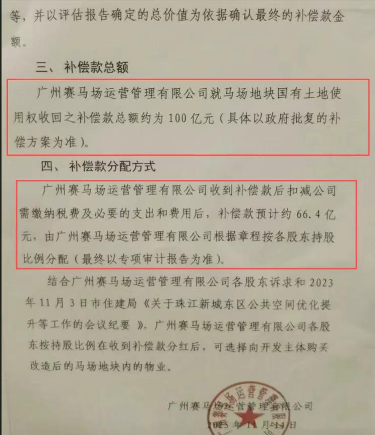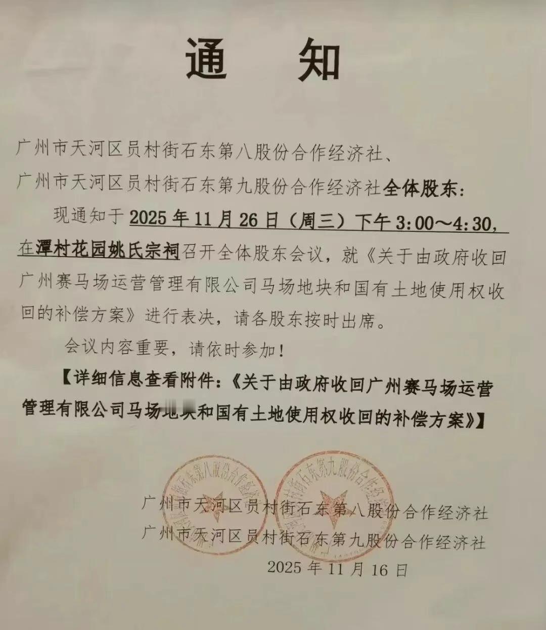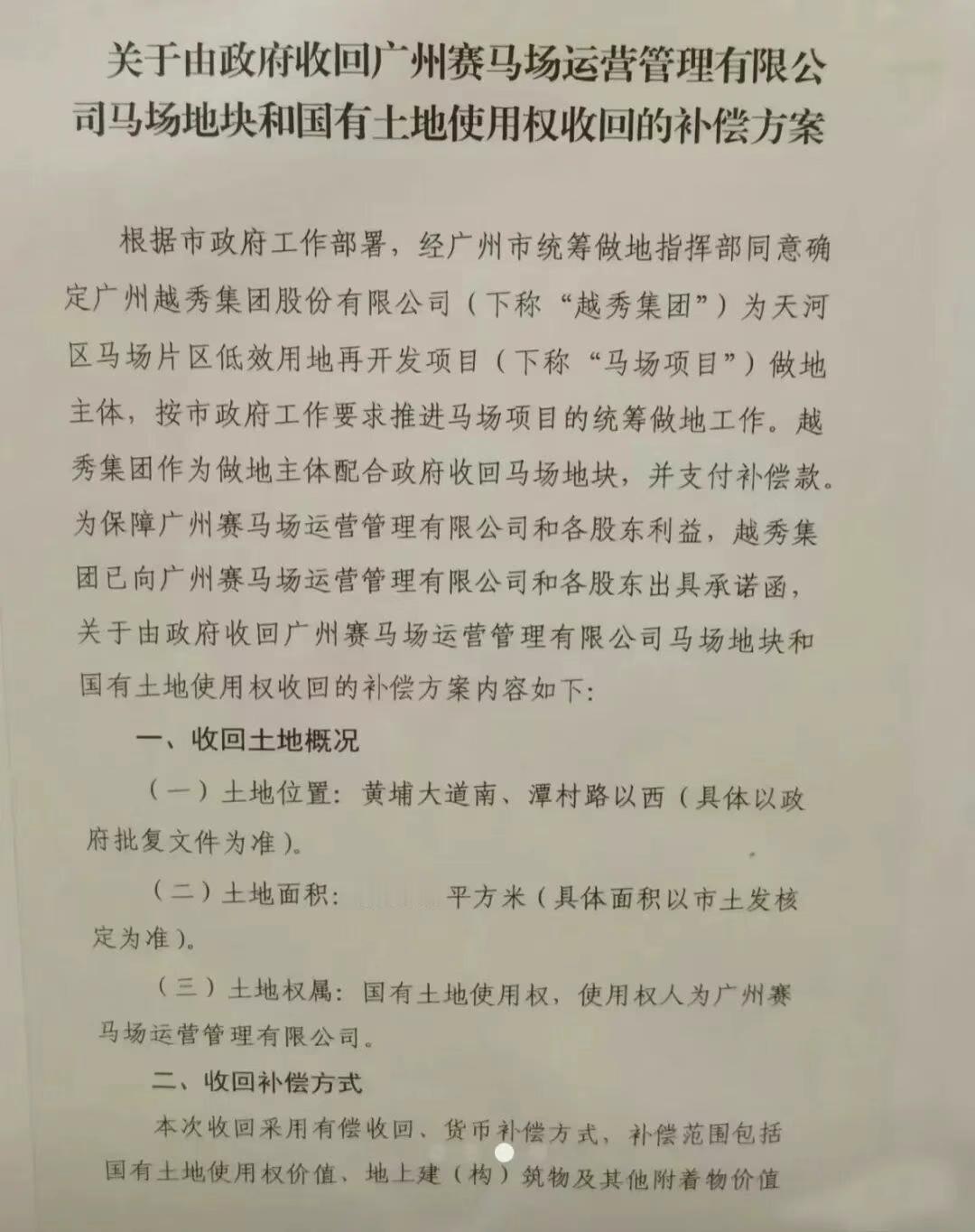 【珠江新城马场地块回收拟补偿100亿!】天河员村街石东第八、第九股份合作经济社全体股东,将在2025年11月26日下午召开大会,就《关于由政府收回广州赛马场运营管理有限公司马场地块和国有土地使用权收回的补偿方案》进行表决。爆料文件透露,广州赛马场运营管理有限公司就马场地块国有土地使用权收回之补偿款总额约为100亿元。这份爆料文件还透露,广州市统筹做地指挥部已同意确定广州越秀集团股份有限公司为天河区马场片区低效用地再开发项目做地主体。越秀集团作为做地主体将配合政府收回马场地块,并支付补偿款。另外,爆料文件也显示,此次收回土地36.2万平。