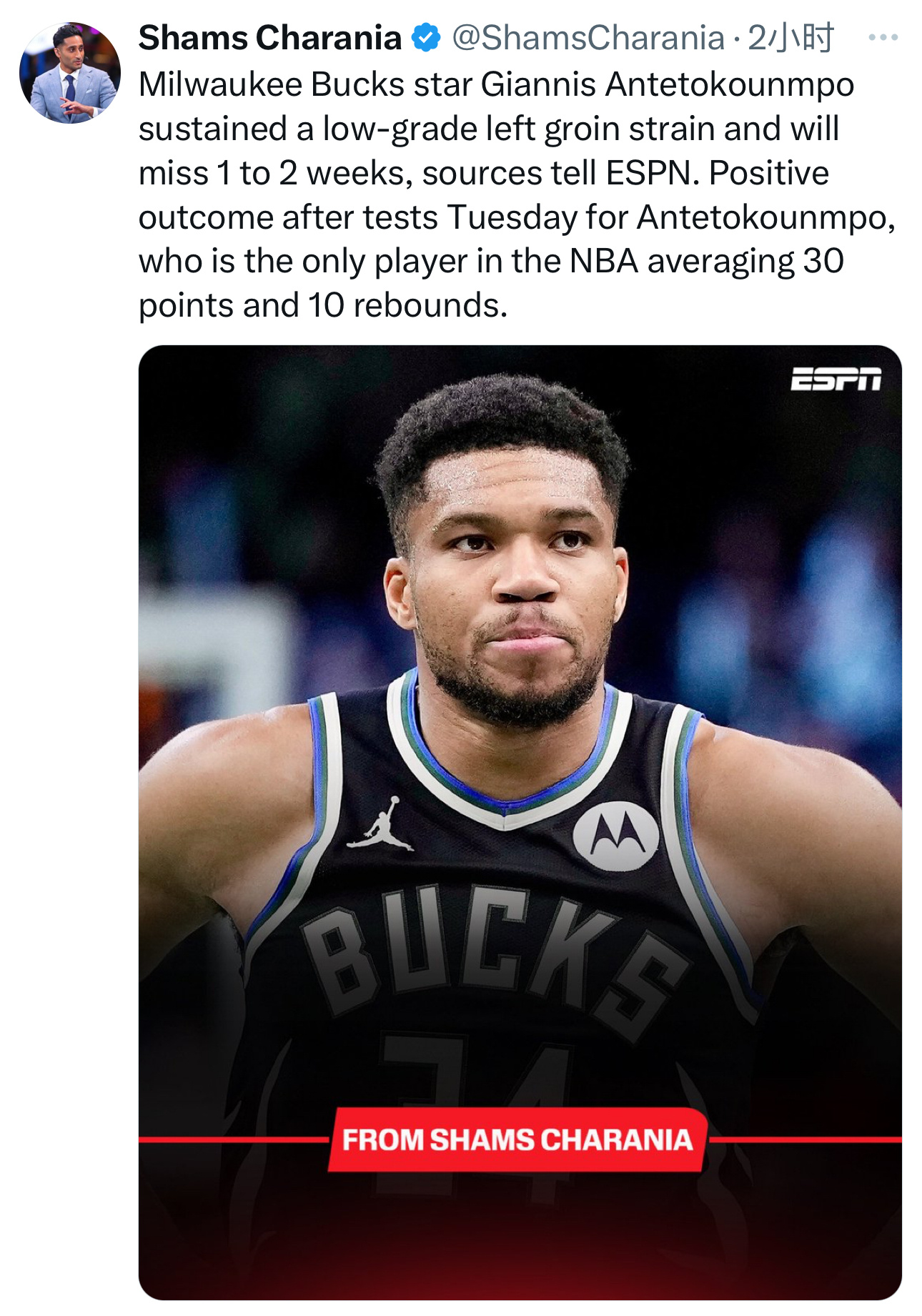 ESPN记者Shams:据消息人士透露,密尔沃基雄鹿队球星扬尼斯·阿德托昆博遭遇左侧腹股沟轻微拉伤,将缺席1至2周。阿德托昆博周二的检查结果呈阳性!费城76人队将于本周五背靠背客场对阵雄鹿队,而雄鹿队将于(北京时间)12月6日周六作客费城!