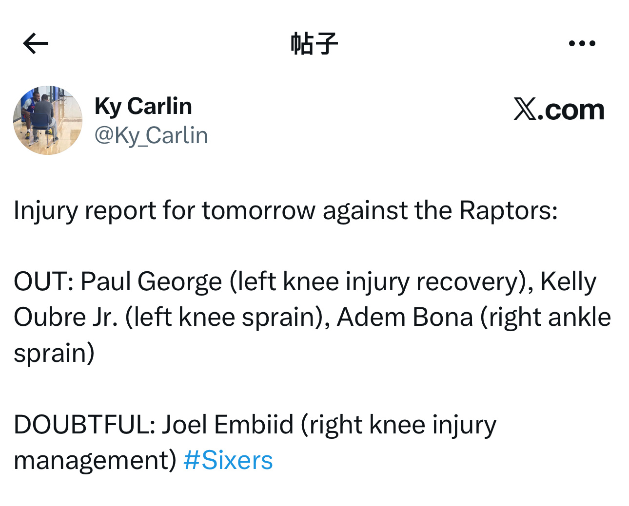 伤病报告更新:明天主场对阵猛龙队,保罗·乔治(左膝伤势恢复中)、阿德姆·博纳(右脚踝扭伤)、凯利·乌布雷(左膝扭伤)均被列为无法出战!乔尔·恩比德(右膝伤势管理)被列为不太可能出战(Doubtful 25%概率)!