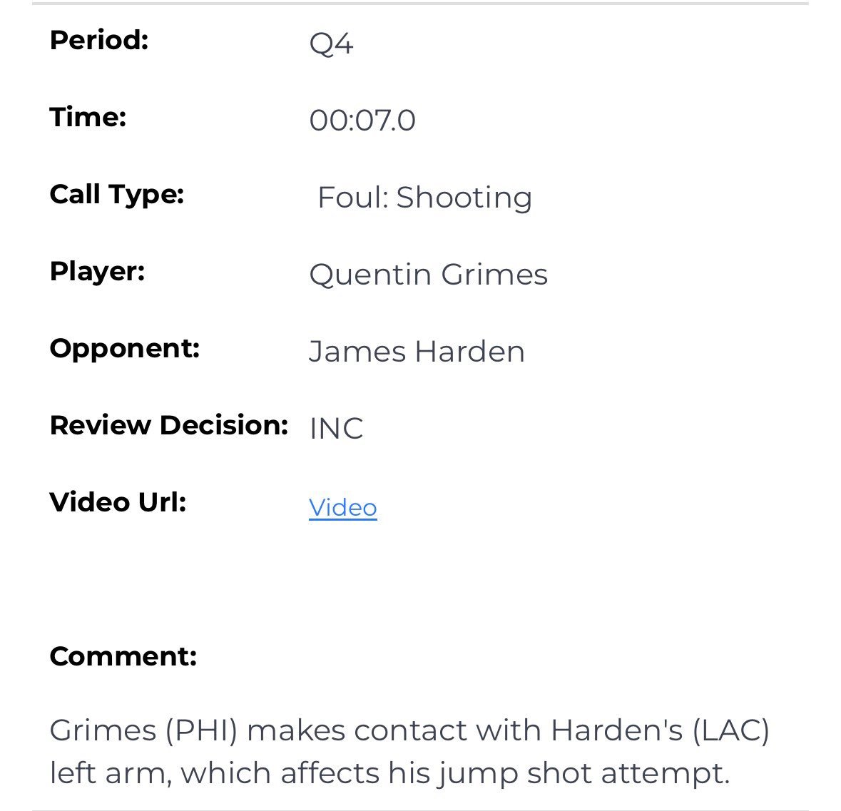 NBA官方公布了昨日76人对阵快船的最后两分钟裁判报告,其中提及比赛第四节剩余7秒时,昆廷·格莱姆斯(76人)在防守过程碰到了詹姆斯·哈登(快船)的左臂,影响了他的跳投出手应被判定为犯规。
