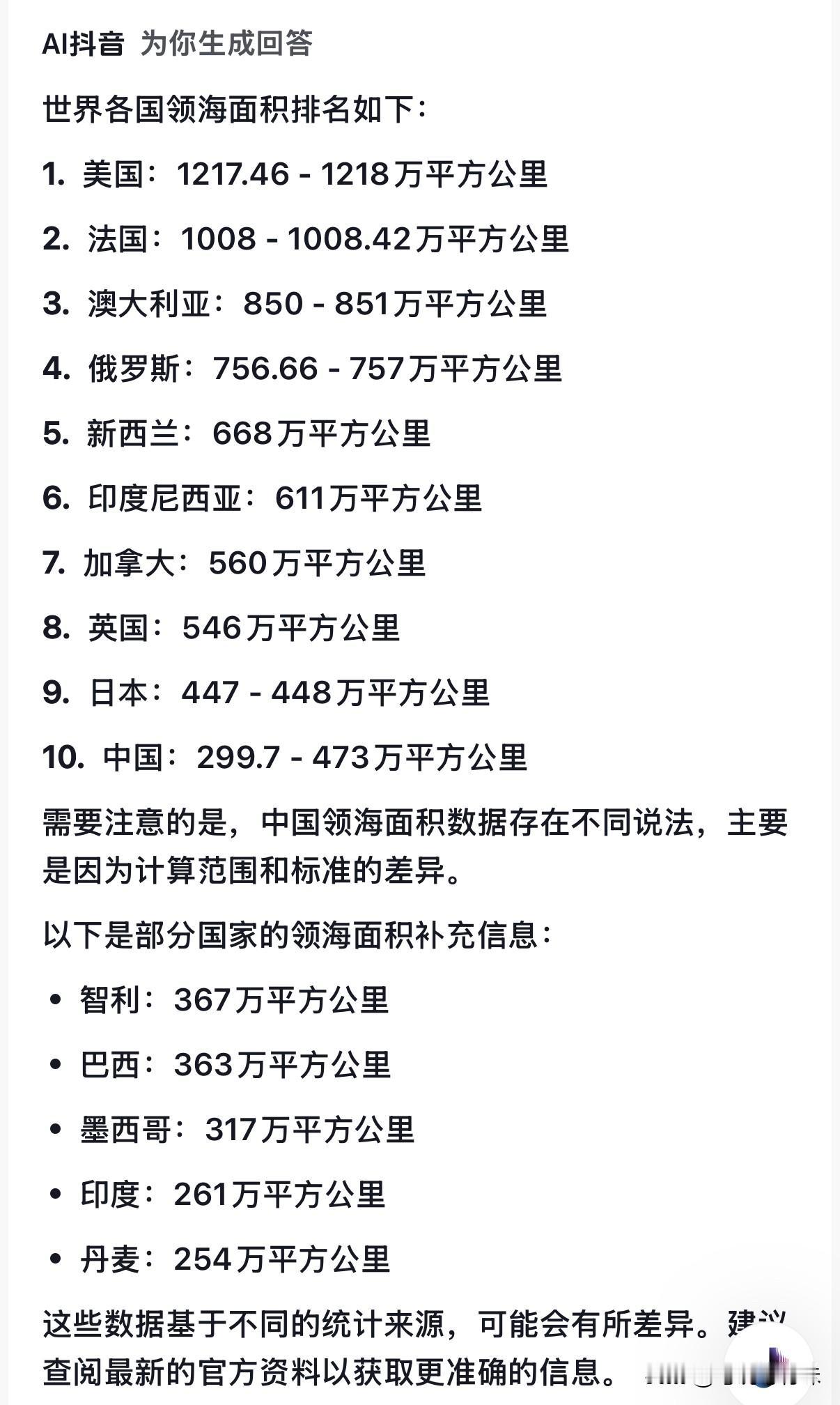 我们看世界各国的国土面积时,常常忽略了世界🌍各国的领海面积,有的国家的领海面积比领土面积还要大。 海洋资源是非常丰富多样的,而且目前的技术还不能够支持人类全面开采海洋🌊资源,谁拥有的领海面积大,在未来可利用开采的资源等就更多。 世界上领海面积最大的是美国🇺🇸,拥有1218平方公里的领海面积,比自己国家的领土面积963万平方公里多了足足255万平方公里。 世界上领海面积第二是一个大家都意想不到的国家:法国🇫🇷,法国拥有着1008万平方公里的领海面积,大家印象中对法国是不是奢侈品收割全球富人的地方?我们要知道法国的国土面积才55万平方公里(不含海外领地),却拥有着比国土面积高18倍多的领海面积,这是非常夸张的,其实力不容小觑。 领海面积排在第三的是澳大利亚🇦🇺,澳大利亚拥有着850万平方公里的领海面积,澳大利亚同时还是世界国土面积排名第6的国家,国土面积达到了768万平方公里,可以说是陆地资源和海洋资源都丰富的地方。 还有俄罗斯🇷🇺这个世界上国土面积最大的国家,拥有着757万平方公里的领海面积,虽然说跟俄罗斯的国土比算少,但是放在全世界这个领海面积是很大了,是世界上领海面积第四的国家。 还有一个领海面积远高于国土面积的国家:英国🇬🇧,英国国土面积只有24万多平方公里(包含内陆水域),却拥有着比国土面积高22倍多的领海面积,其领海面积高达546万平方公里。 美国能拥有如此大的领海面积是源于他的经济和军事实力,俄罗斯拥有如此大的领海面积是因为俄罗斯国土面积大又靠海,那么法国和英国又是为什么能拥有如此多的领海面积呢?你知道吗? 欢迎各位在评论区留言👏 美国 俄罗斯 英国