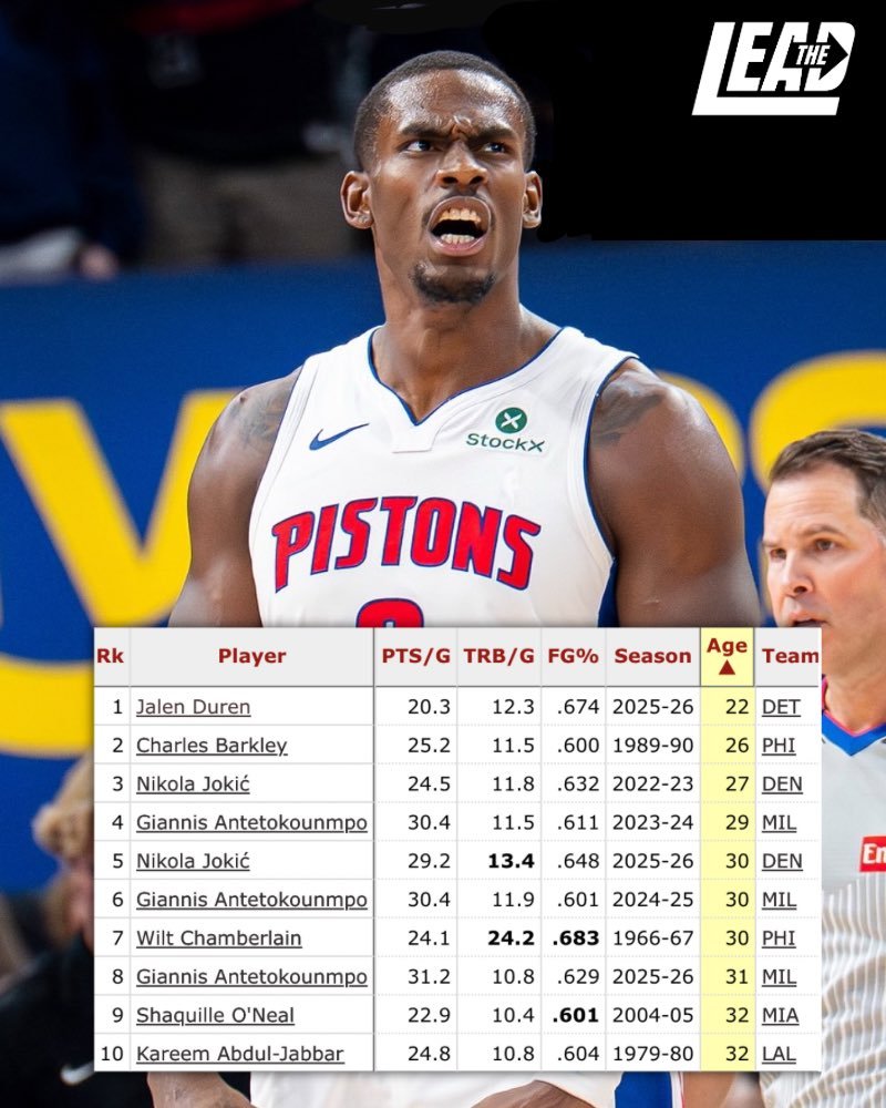 单赛季60%+命中率20+10的球员名单Giannis - Antetokounmpo - Nikola Jokic- Charles Barkley - Wilt Chamberlain - Kareem Abdul-Jabbar - Shaquille O’Neal还有本赛季的杜伦他才22岁??!!