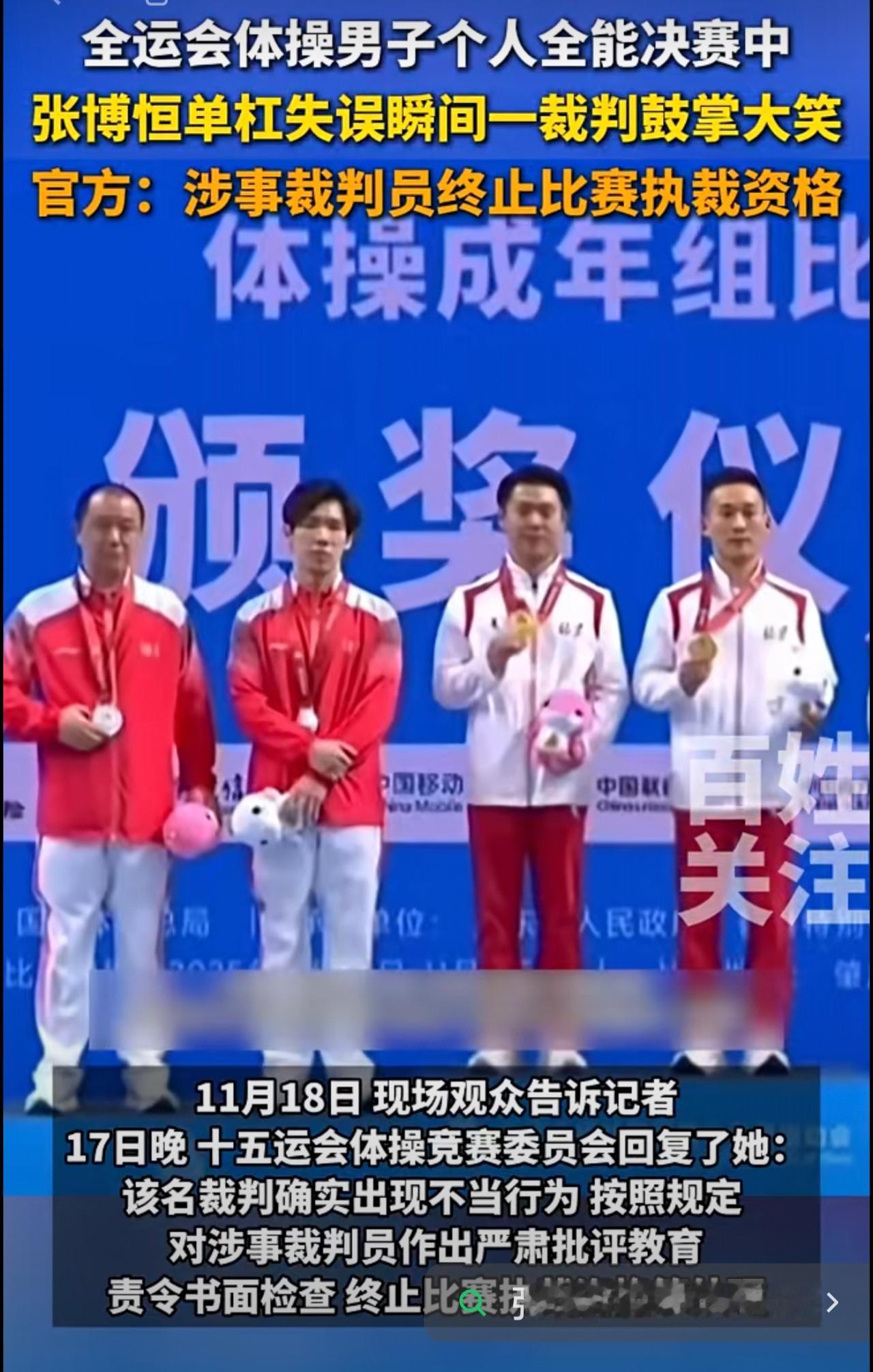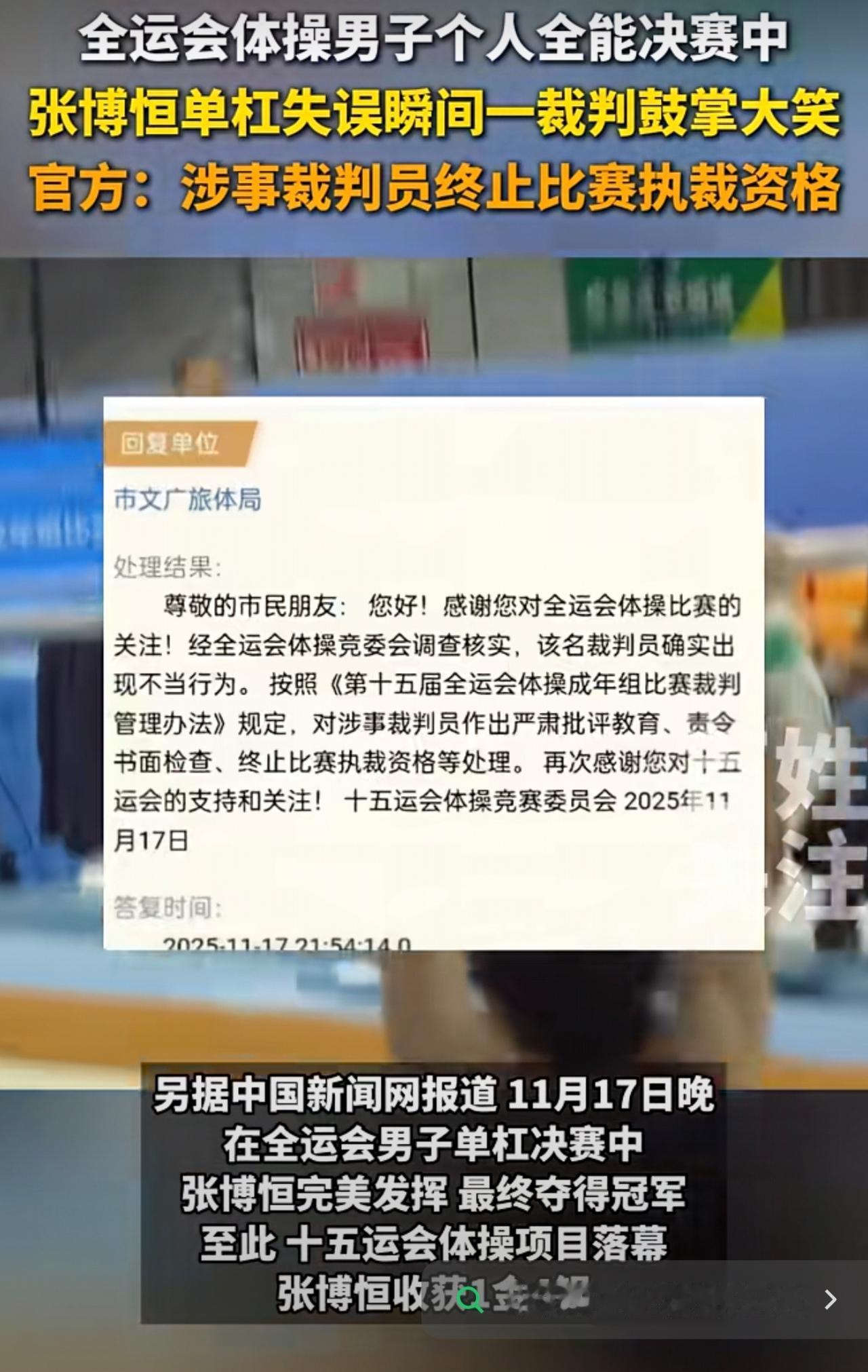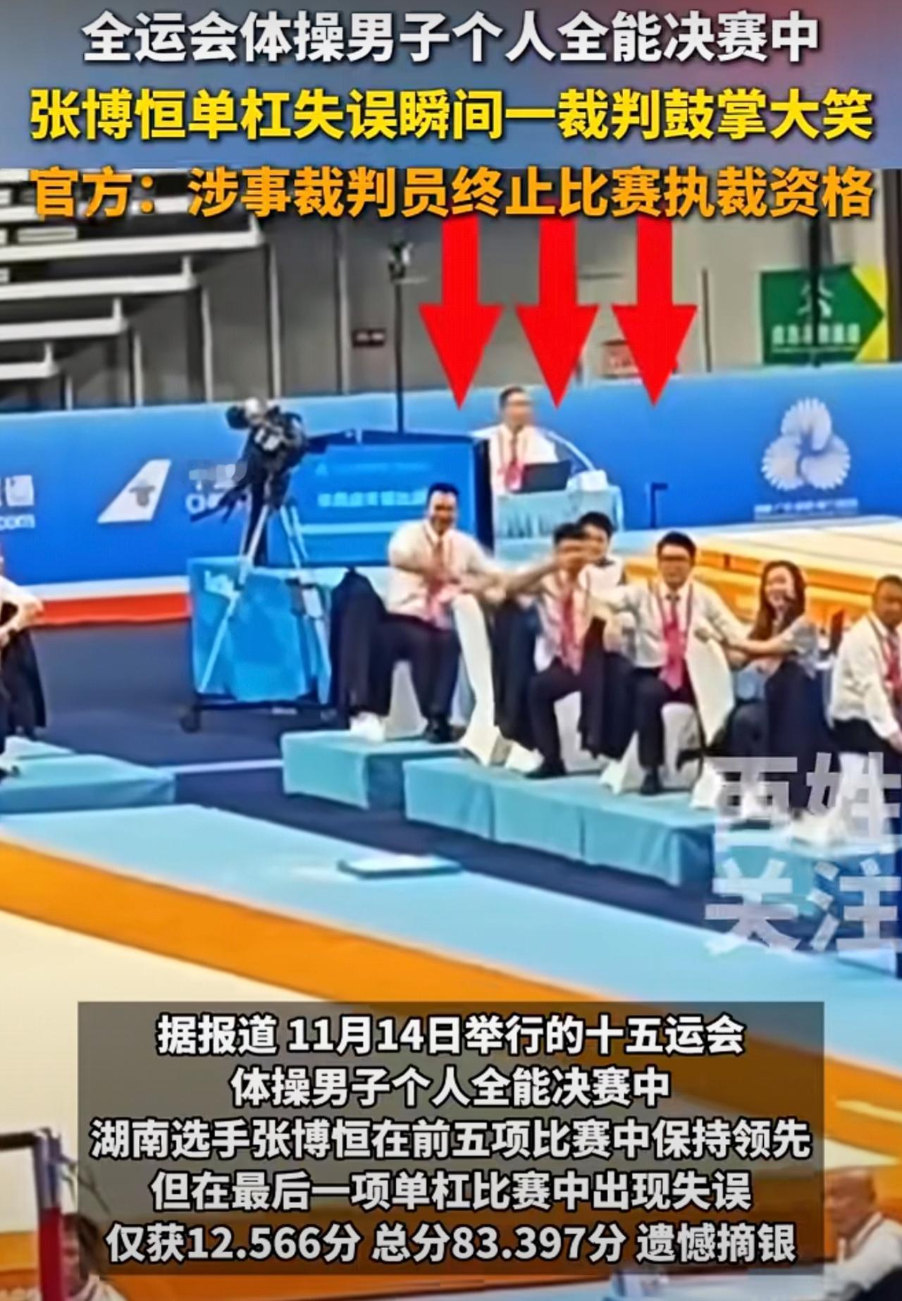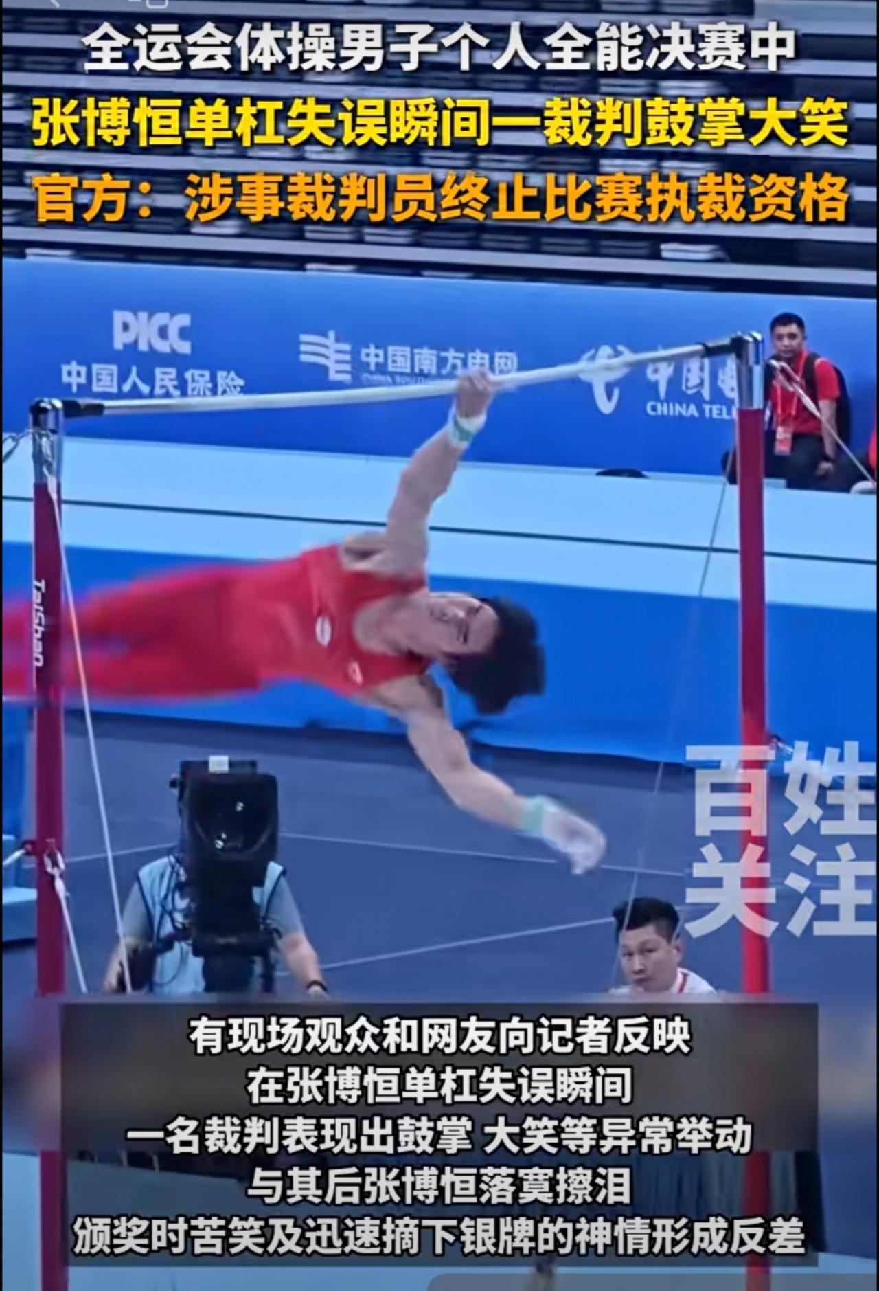 张博恒单杠失误瞬间一裁判鼓掌大笑遭质疑,官方回应:涉事裁判员终止比赛执裁资格。