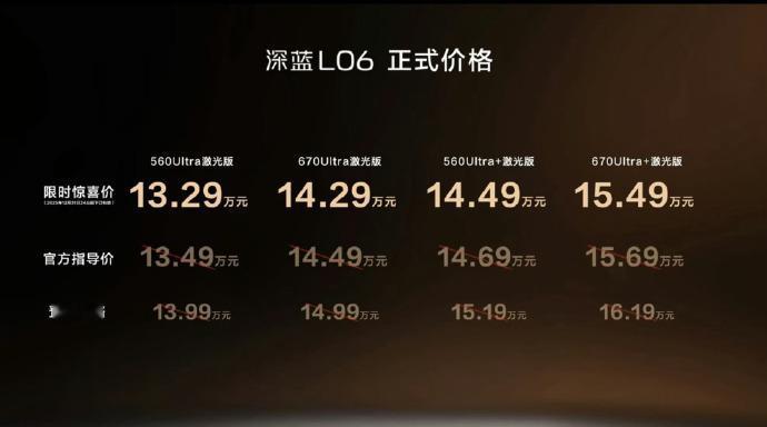 深蓝L06上市,售价13.49万元-15.69万元,12月31日24点前可享限时惊喜价13.29万元-15.49万元。新车后置200kW电动机,峰值扭矩290N·m,CLTC续航里程有560km和670km两个版本。【来自懂车帝车友圈】
