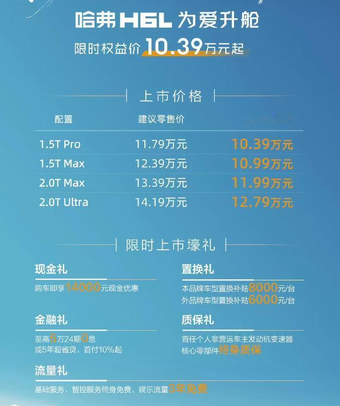 哈弗H6L上市,售价11.79万元-14.19万元,11月30日前可享限时权益价10.39万元-12.79万元。入门车型搭载1.5T+7DCT的动力组合,最大功率135kW,峰值扭矩275N·m;高配车型搭载2.0T+9DCT的动力组合,最大功率175kW,峰值扭矩385N·m。【来自懂车帝车友圈】