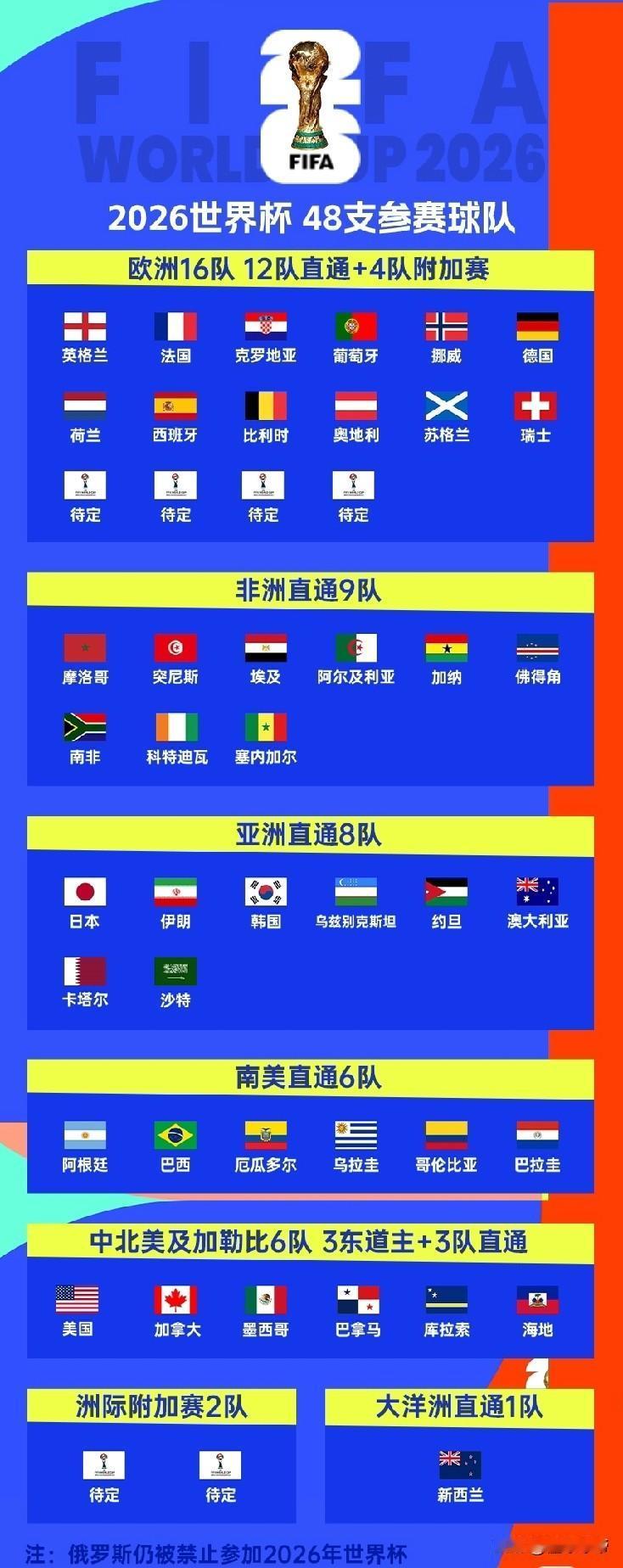 世界杯扩军后不少球队都圆梦世界杯,国足怎么就进不去呢? 2026美加墨世界杯各大洲的预选赛已经全部结束,目前已经有42支球队确定晋级世界杯决赛圈,只剩6个名额将通过明年的附加赛来确定。 这是世界杯扩军48支球队后首届世界杯,因此不少曾经的足球小国家都抓住了这次机会,非洲的佛得角,亚洲的约旦和乌兹别克斯坦,中北美地区的库拉索都是历史首次进入世界杯。 还有其他不少国家都是时隔多年再次进入世界杯,比如海底时隔52年进入世界杯(一个天天吃土的国家都能进世界杯),挪威,苏格兰和奥地利都是时隔28年进入世界杯。 本来国际足联扩军的目的是为了让足球大国中国男足进入世界杯,没想到国足不争气机会却拱手让给了其他国家,看来国际足联只能再次扩军了,要不然国足始终无法进入世界杯。