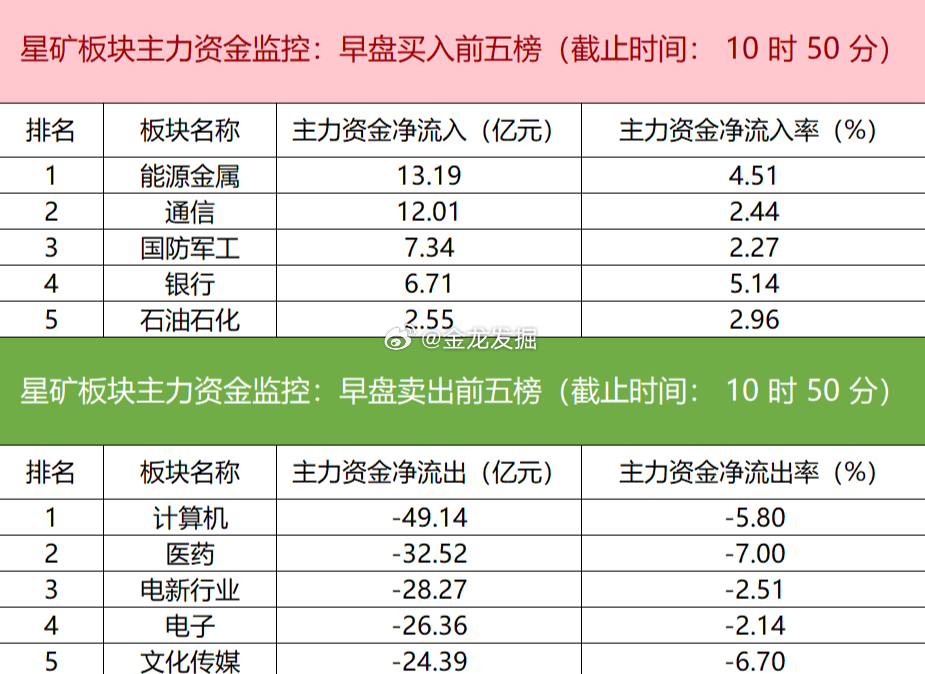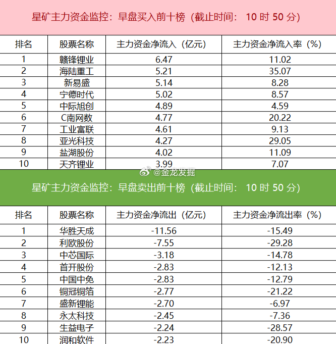 【主力资金监控:赣锋锂业净买入超6亿元】今日早盘主力资金净流入能源金属、通信设备及国防军工板块,净流出计算机应用、化学制药及电力设备板块,其中计算机应用板块净流出超45亿元。个股方面,$赣锋锂业 sz002460$ 大涨,主力资金净买入6.47亿元居首,$海陆重工 sz002255$ 、$新易盛 sz300502$ 、宁德时代获主力资金净流入居前;华胜天成遭净卖出超11亿元,利欧股份、中芯国际、首开股份主力资金净流出额居前。