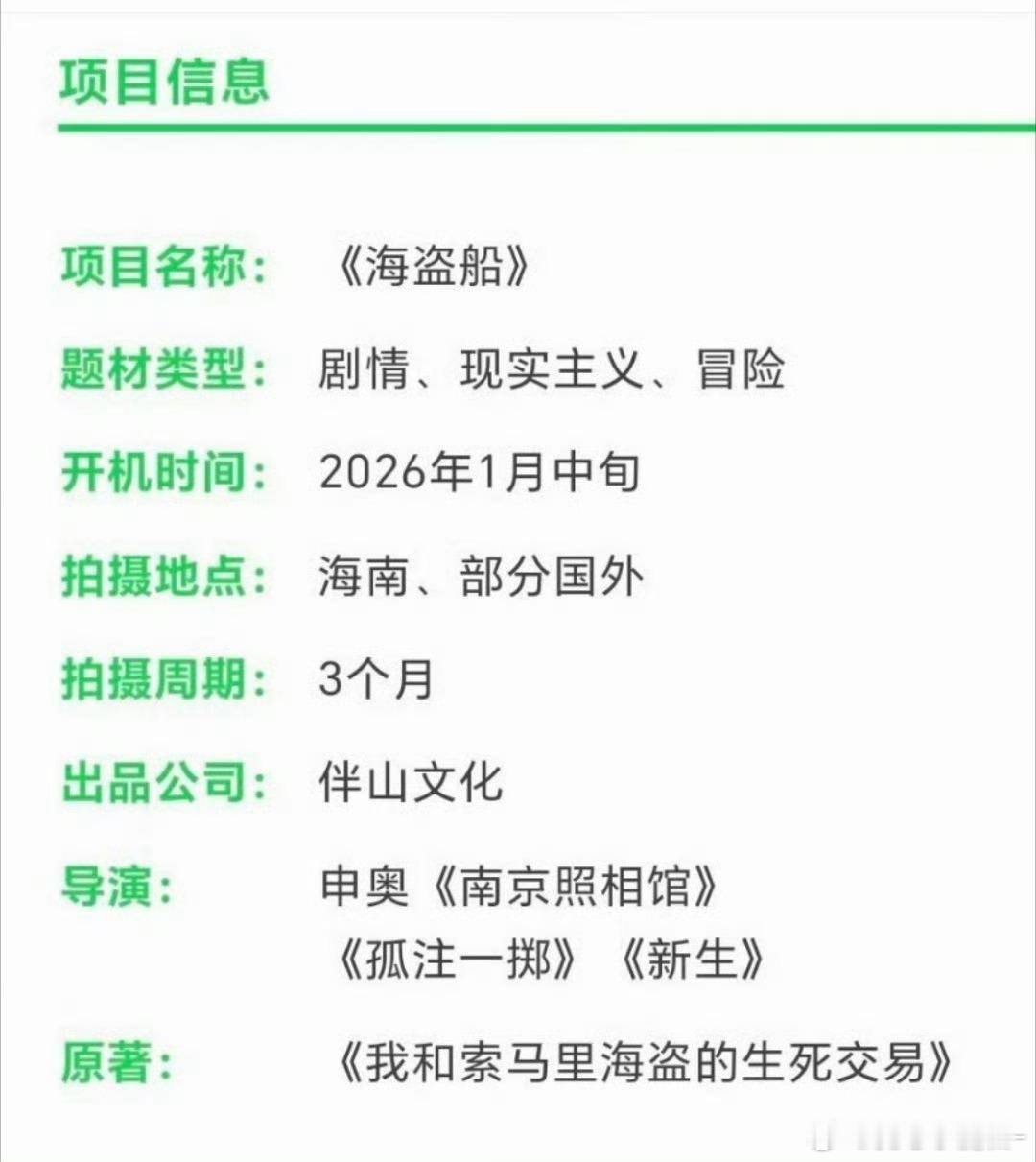 🍉于适 《海盗船》26年初开机导演:申奥(《孤注一掷》《新生》)